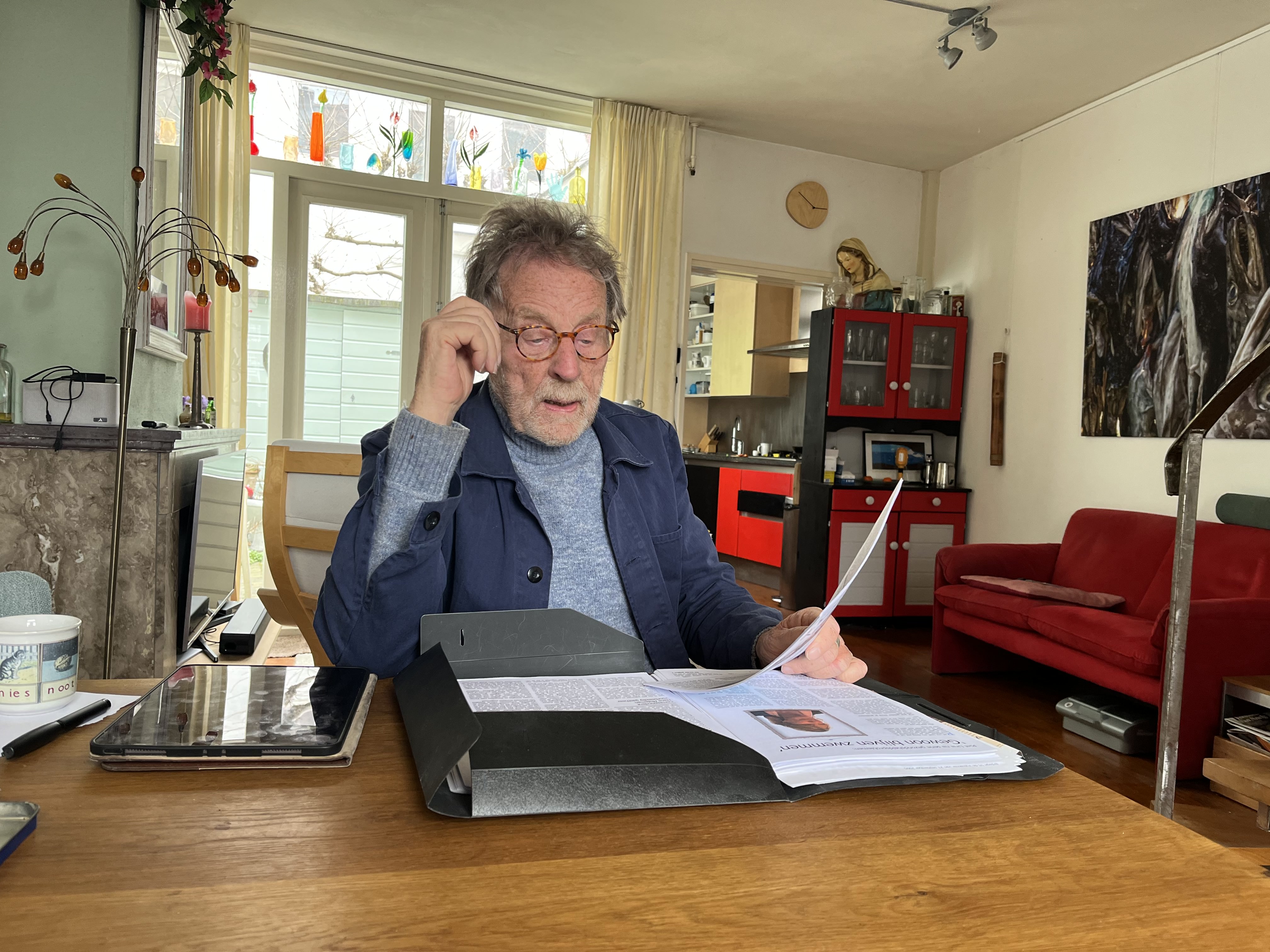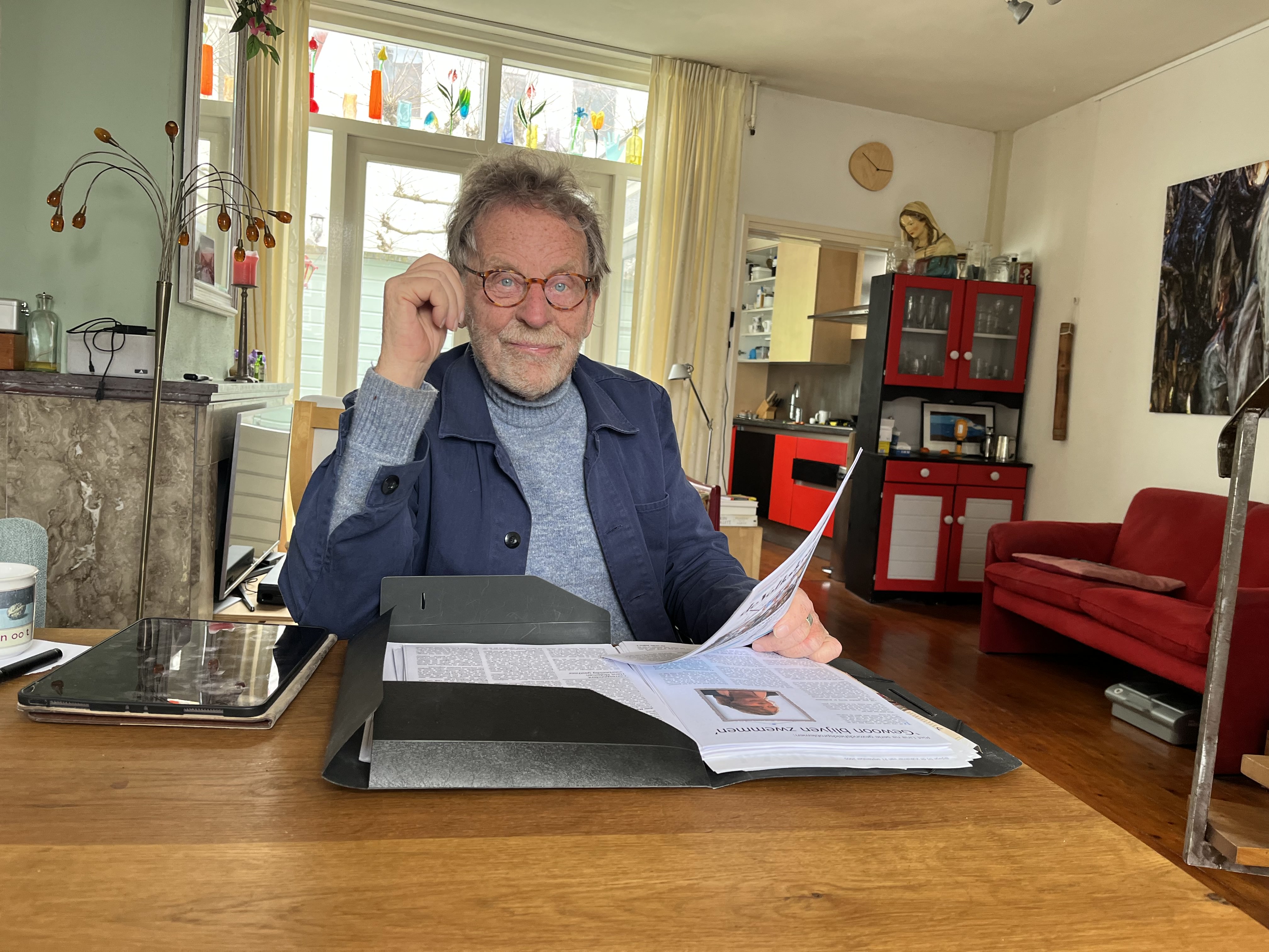 ‘Voor de Volksknar ging De Jong naar bijeenkomsten om ideeën op te doen en om mensen te interviewen. En hij bezocht veel boekpresentaties, want dat is wat mensen op onze leeftijd doen: boeken schrijven’, lacht hij aan de telefoon. ‘Hij ging vaak met mij mee naar interviews als fotograaf. Hij had veel petjes tegelijkertijd op.’