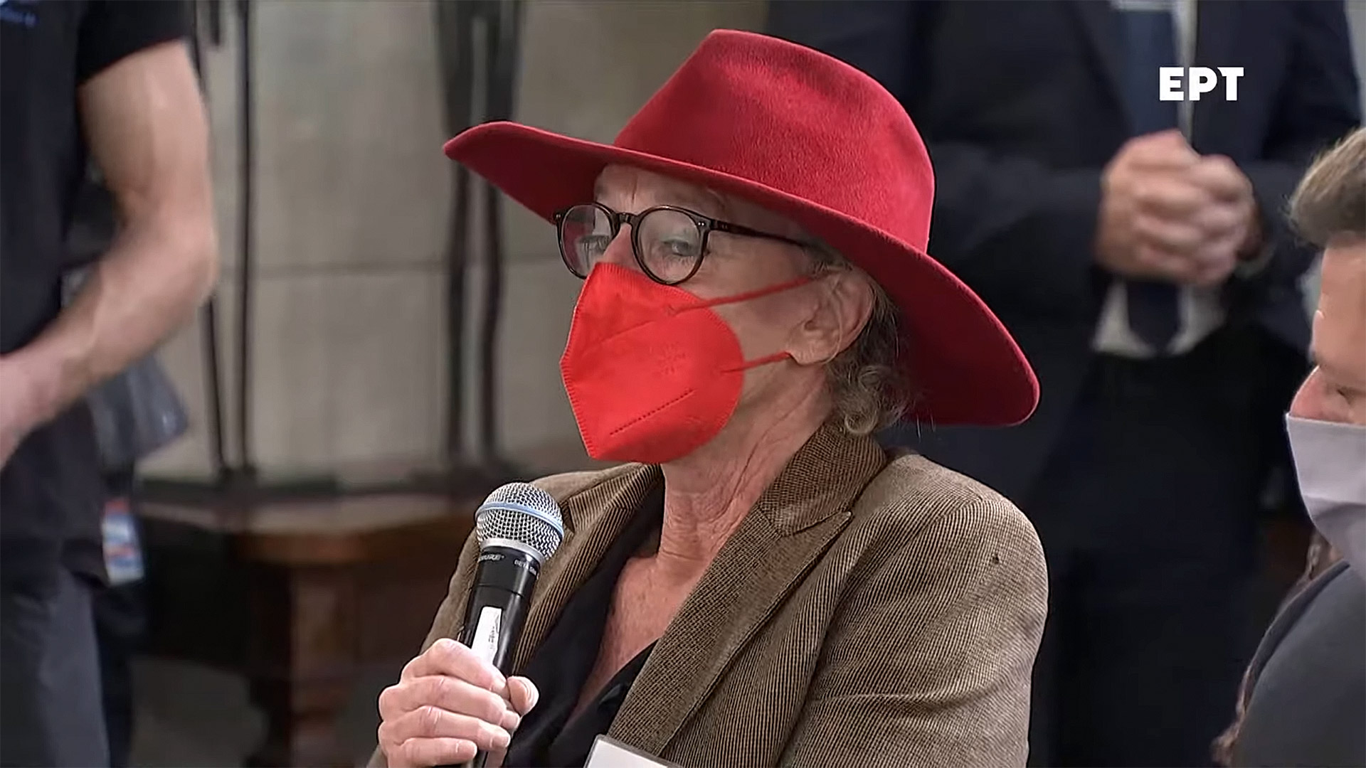 Ingeborg Beugel tijdens de perconferentie, met haar inmiddels iconisch geworden rode hoed. Ze kan er na bedreigingen zelf niet meer mee over straat, vertelt Beugel. | EPT