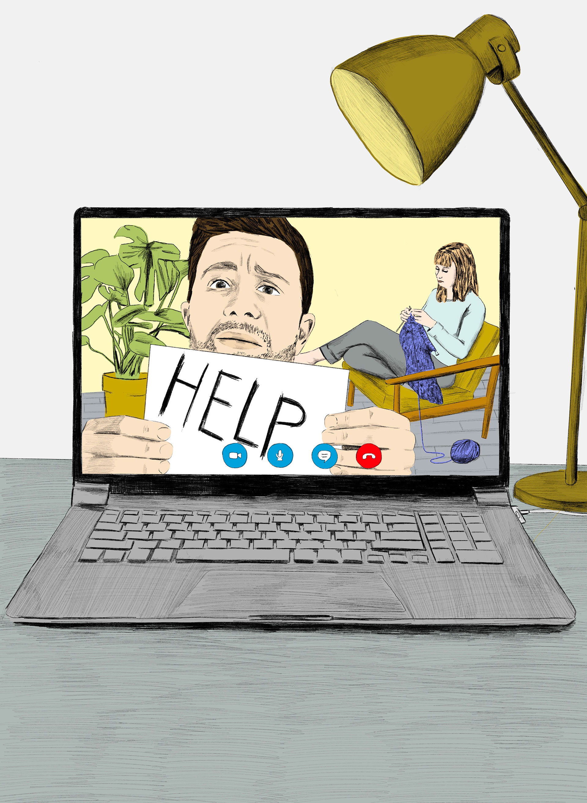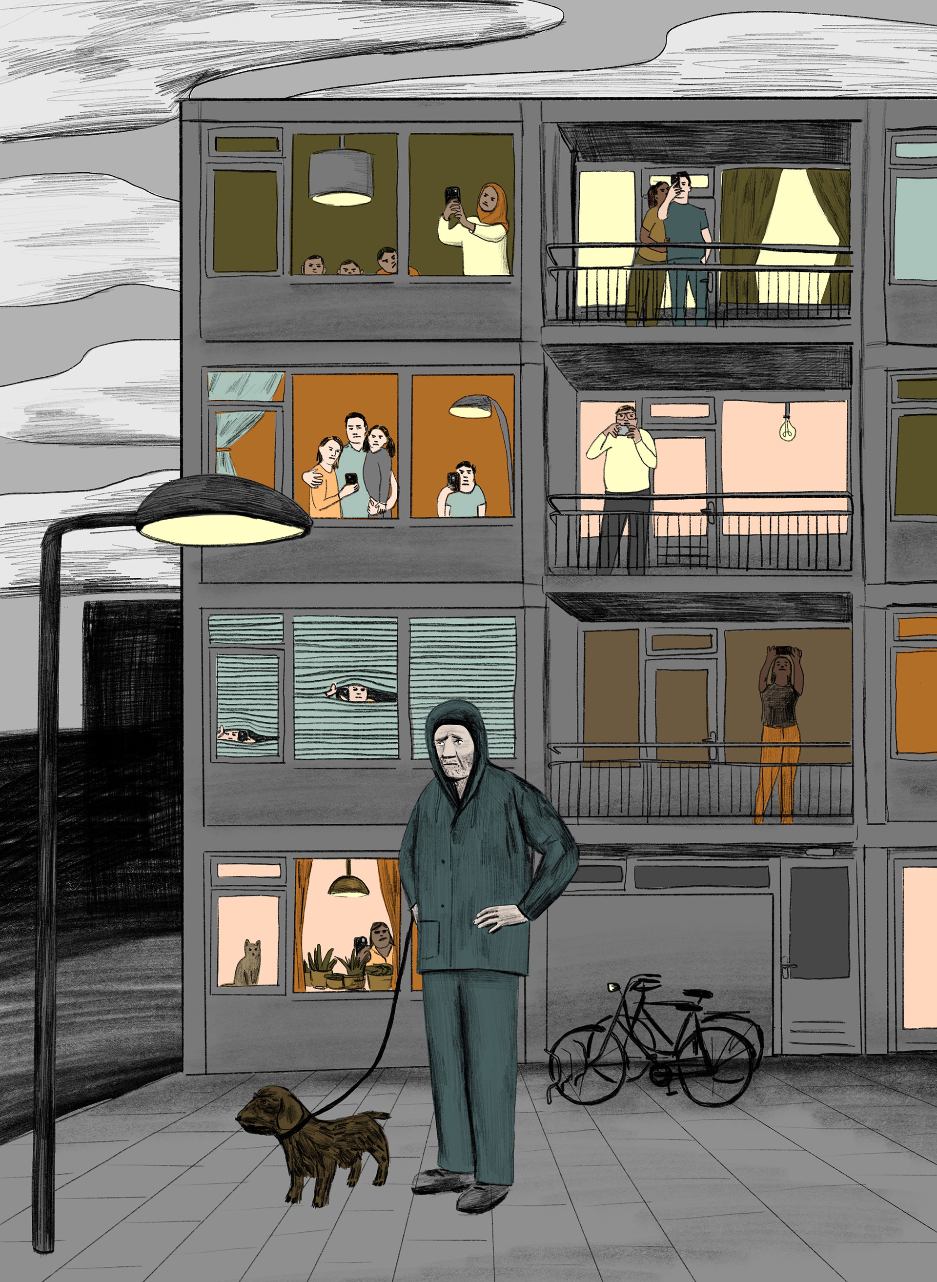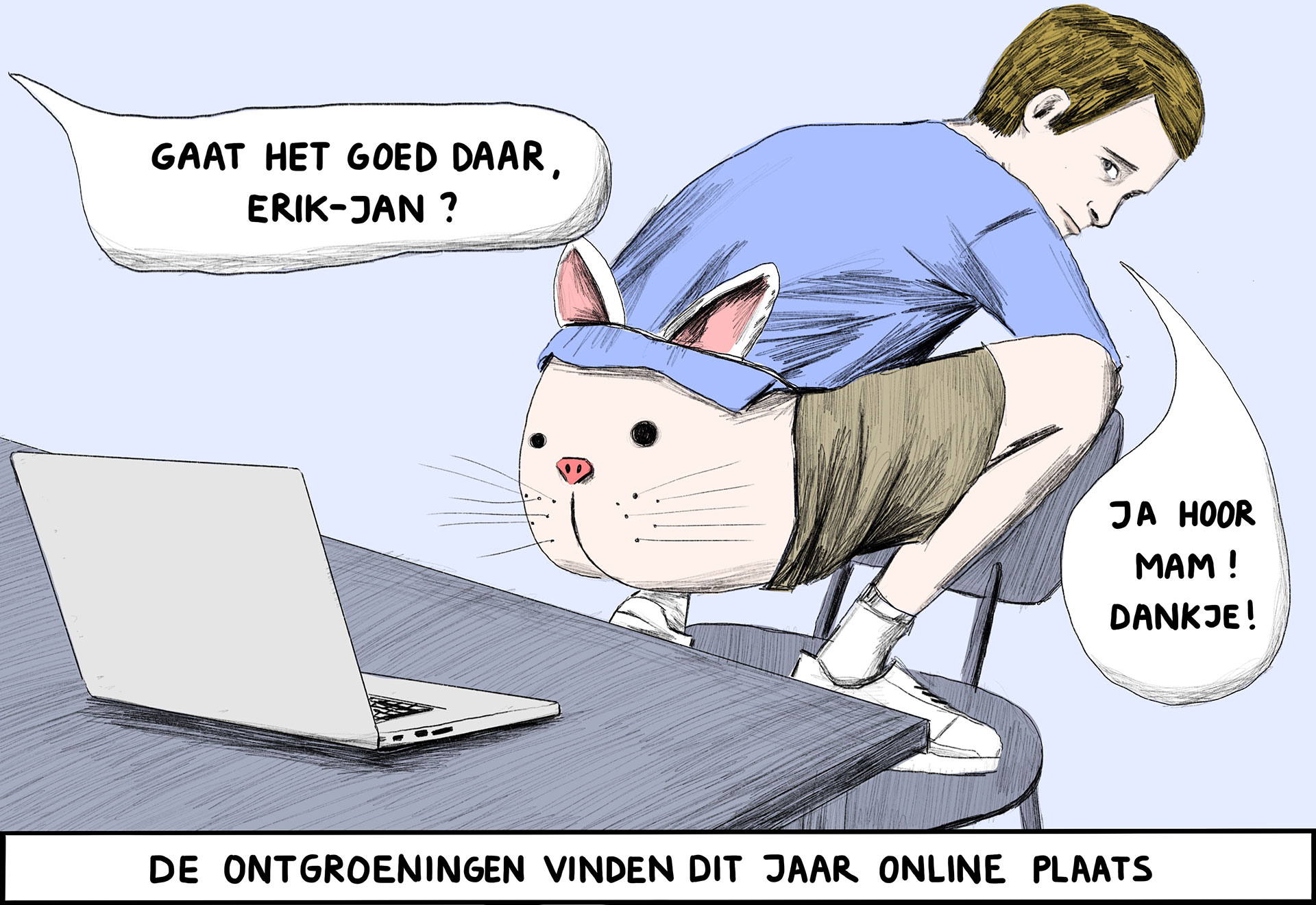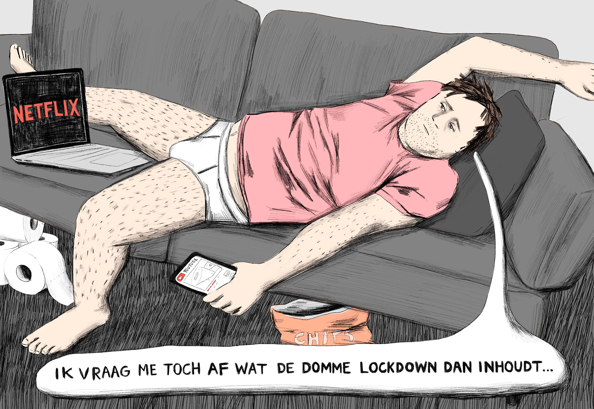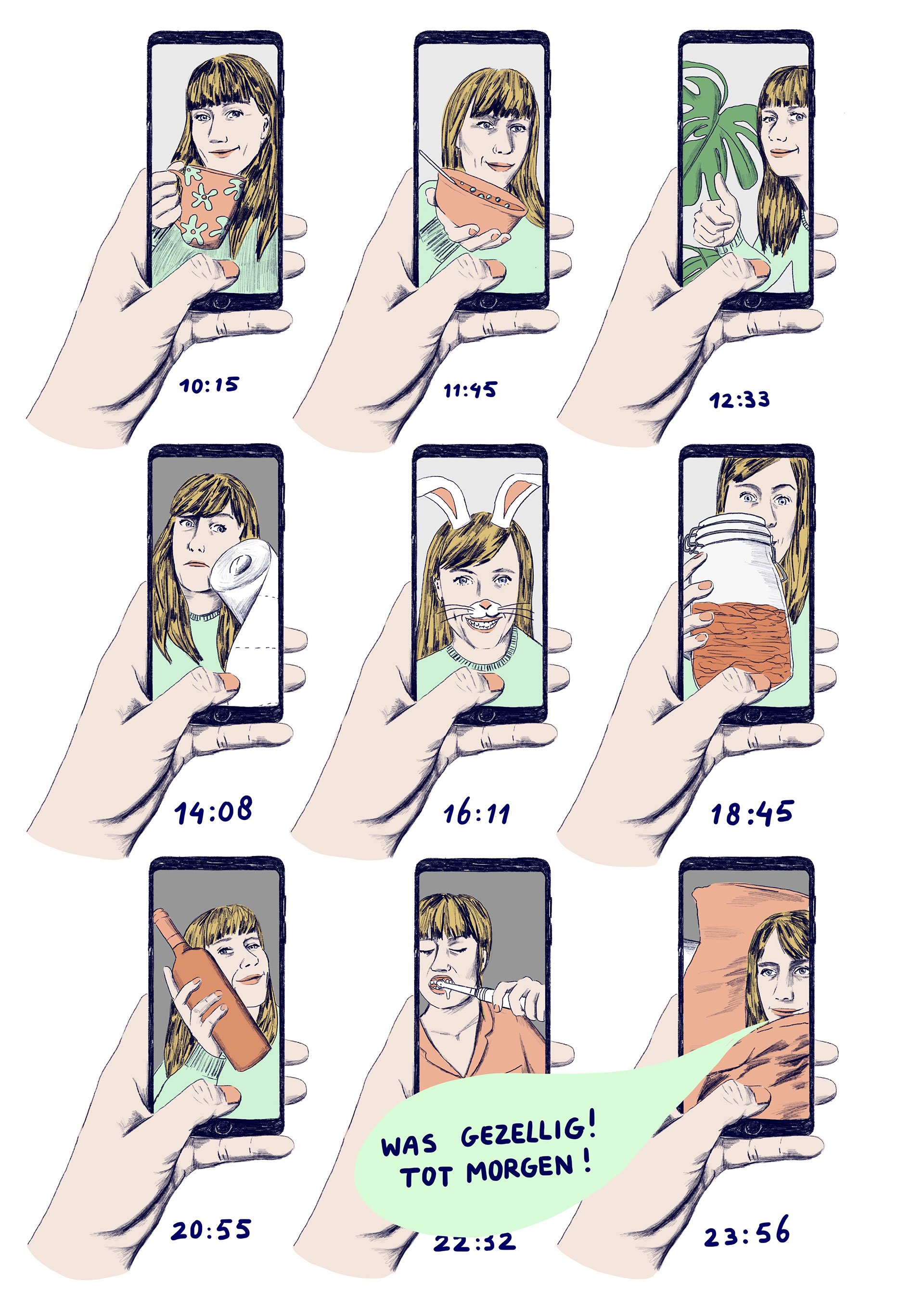 Corona leek haar te gaan vloeren terwijl het virus haar begin dit jaar juist onverwacht veel had gebracht. ‘Oh shit’, dacht ze direct na de uitbraak. ‘Nu gaan ze natuurlijk mijn tekeningen voor stockfoto’s vervangen. Het is een crisissituatie, iedereen gaat dood. Niemand zit op mijn grappige tekeningen te wachten.’ Het bleek een verkeerde inschatting, in haar haar voordeel. Alle fotoshoots voor kranten en tijdschriften werden vanwege corona afgezegd. En toch was er beeld nodig. Van den Toorn: ‘Ik kreeg het ineens apedruk, niet normaal. Het nieuws veranderde razendsnel, ik had altijd iets te doen.’ Haar vriend Andrea maakte iedere dag verse pasta’s, zodat zij door kon gaan. Zo kwamen er dagelijks twee of drie tekeningen uit haar hand, bestemd voor de Volkskrant, Het Parool, De Standaard en de VPRO-gids.