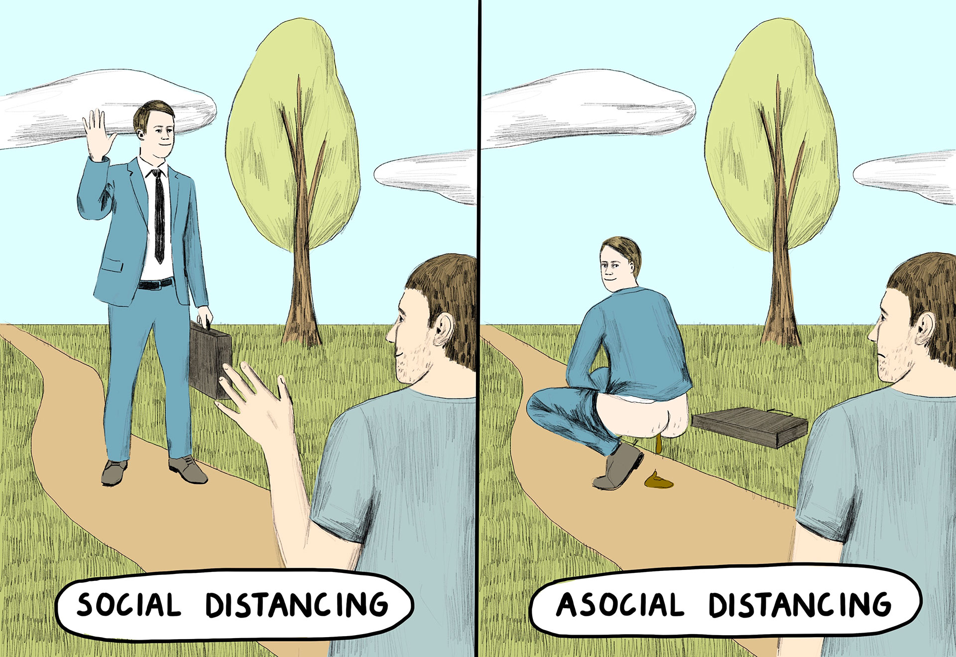 Nu gaan ze natuurlijk mijn tekeningen voor stockfoto’s vervangen. Het is een crisissituatie, iedereen gaat dood. Niemand zit op mijn grappige tekeningen te wachten.
