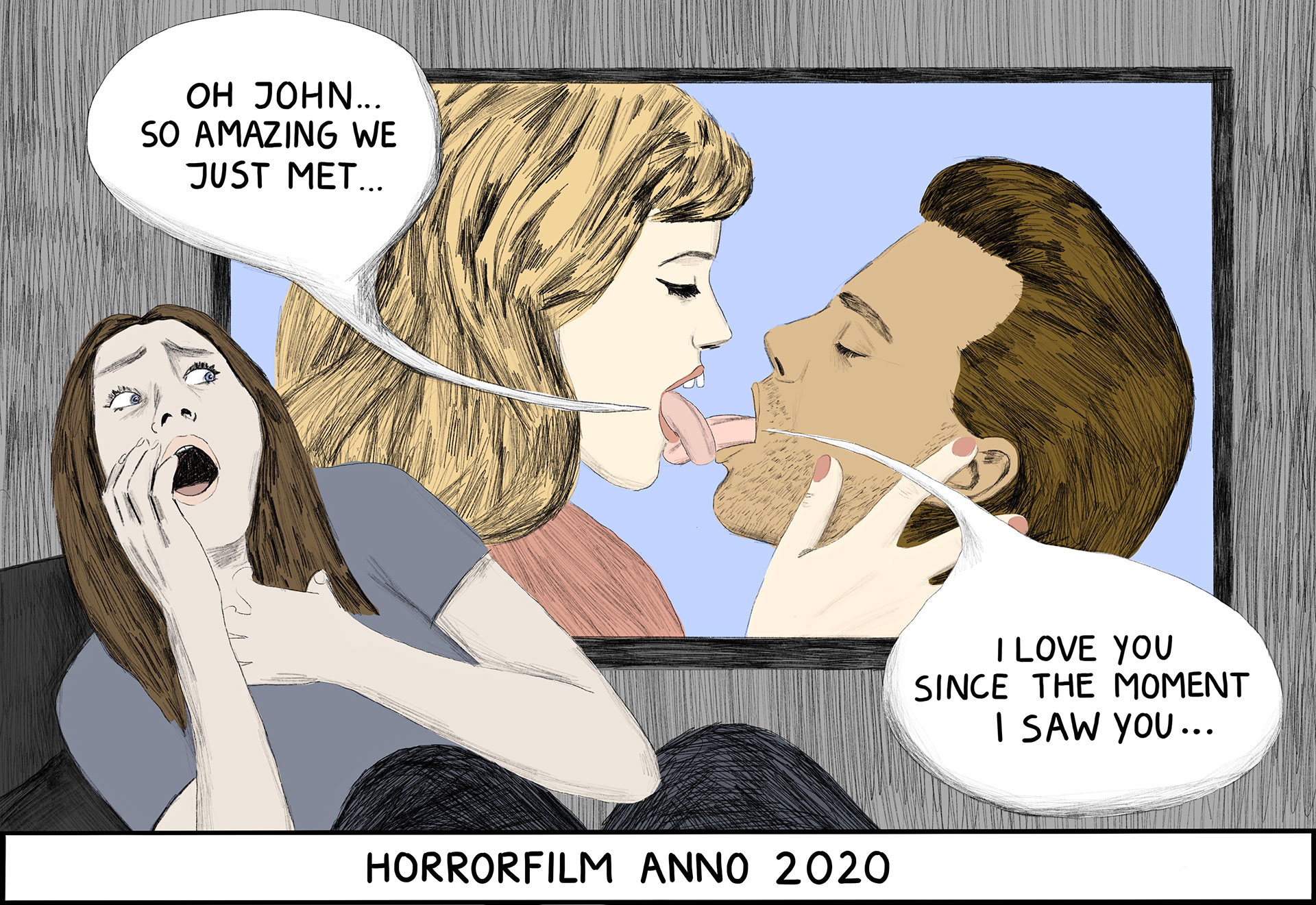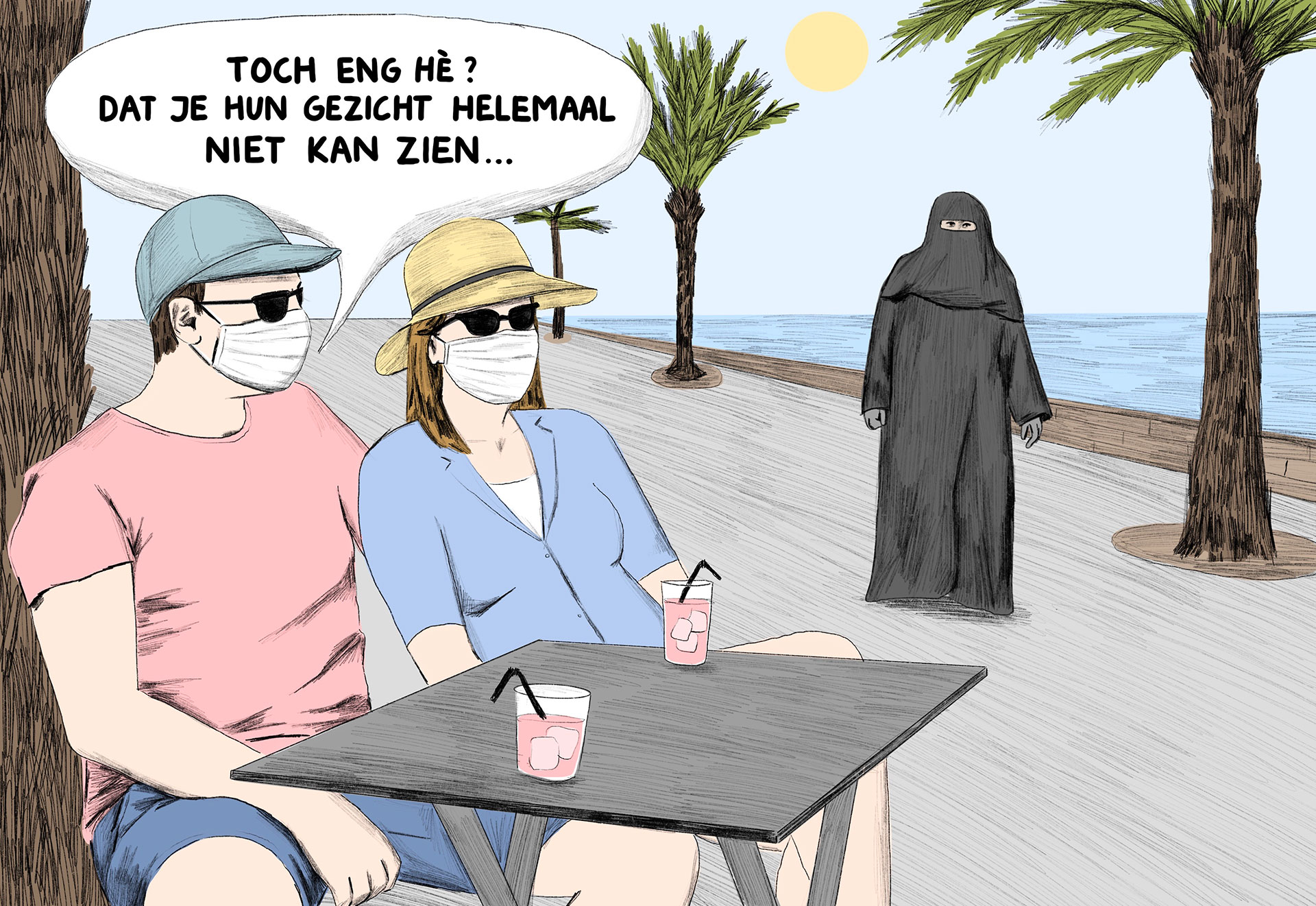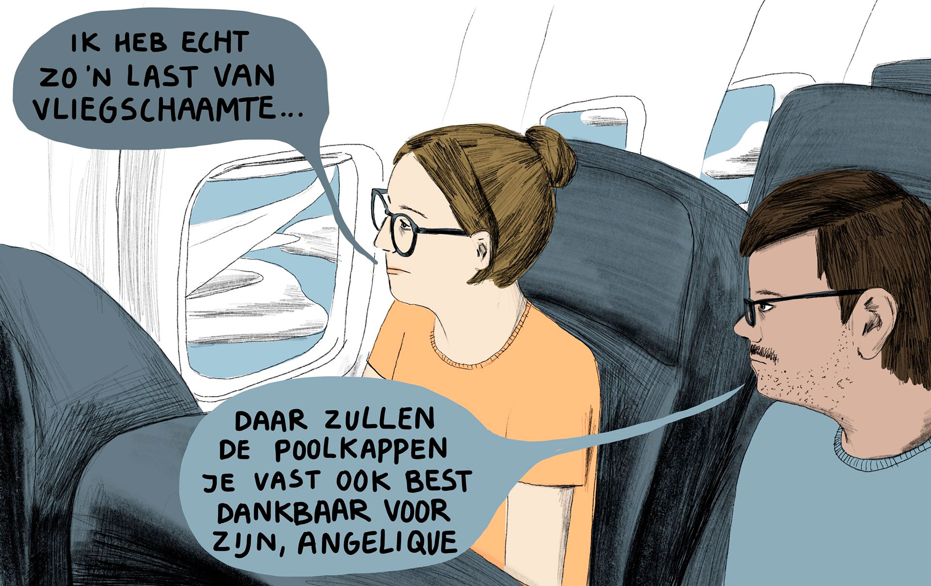 Ze stortte zich als een kamikazepiltoot op de opleiding Illustreren. ‘Communiceren met hulp van een beetje humor, dat lag mij goed,’ zegt ze terwijl een kille mist begint op te trekken. Het zwarte water naast ons blijft roerloos stil. Na de opleiding kwam de inspiratie, vertelt ze. Ze begon het nieuws gulzig te volgen. Talkshows, podcasts, gossip, alles over BN’ers en ‘onzintelevisie’, zoals Temptation Island, ze verorberde alles. De dagen vulden zich met tekenen, de ideeën broeiden permanent in haar hoofd. Ze wikte en woog andermans meningen, zolang zijzelf maar genuanceerd bleef.