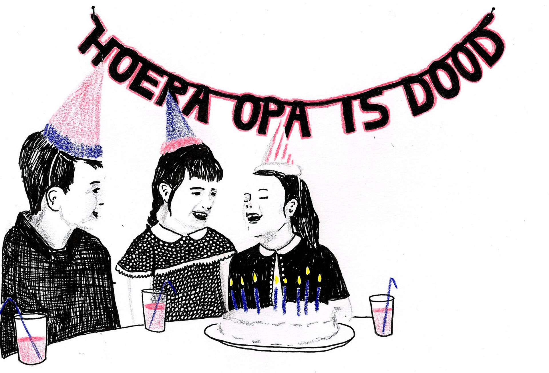 Ze schuift heen en weer op haar stoel, de kou begint te verkleumen. Het gesprek duurde langer dan gedacht. Dit was de laatste vraag, hoort ze, waarna ze haar handen op de tafel plant. Haar gezicht vertrekt. Is de rat terug? Heeft hij zijn vriendjes meegenomen? ‘Ik ben vandaag jarig!’, jubelt ze. ‘Ik moet nu snel naar Hannekes Boom Daar zitten al mijn vrienden op me te wachten.’