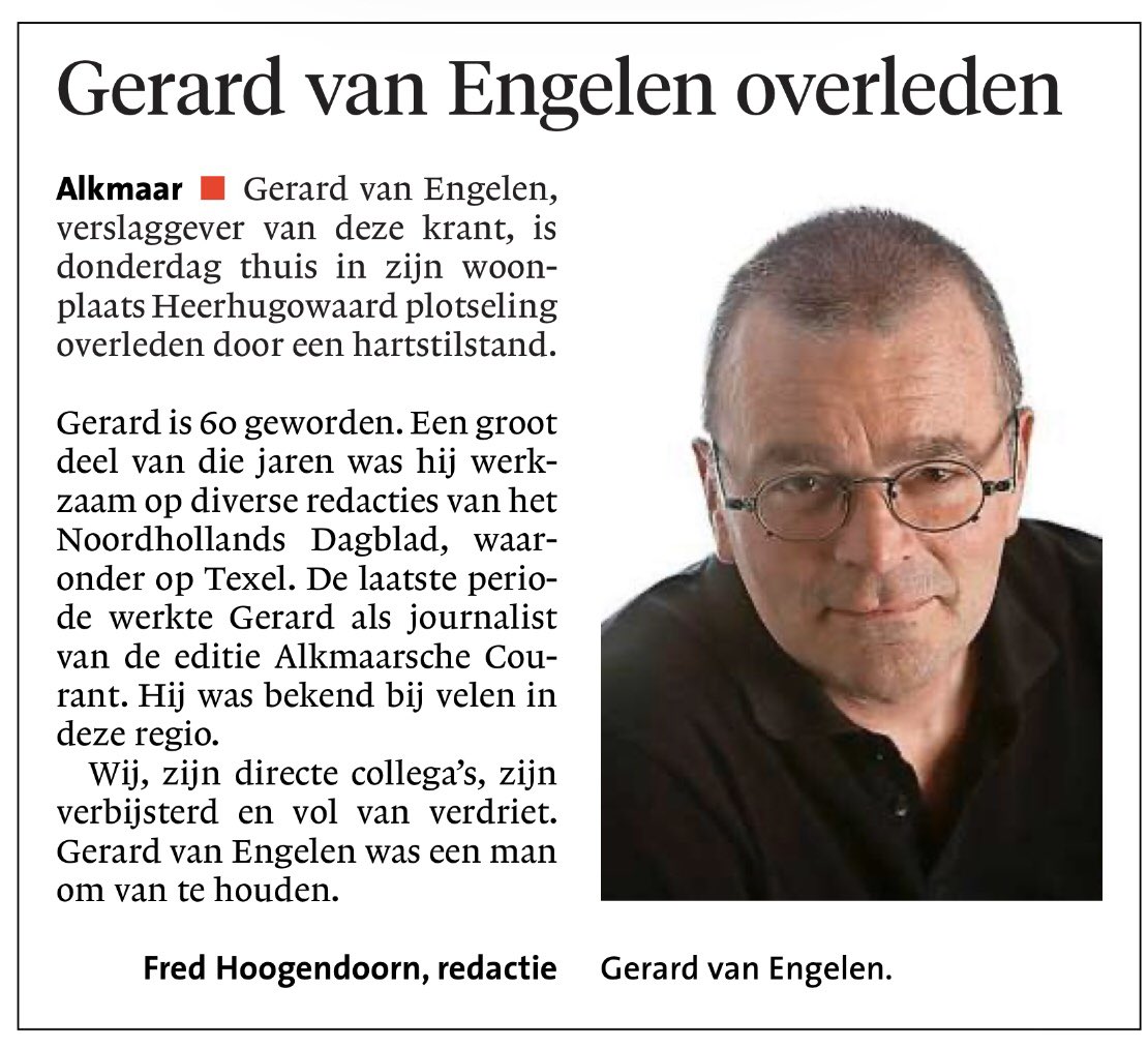 Gerard van Engelen, verslaggever van het Noordhollands Dagblad, is vorige week donderdag plotseling overleden. Dat meldt zijn krant. Van Engelen is 60 jaar geworden.