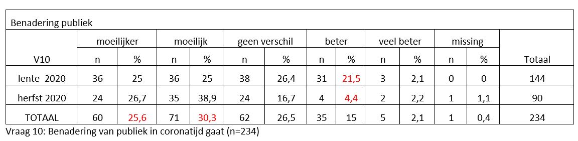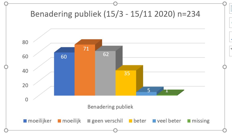 De benadering van het publiek ervoer 30% van de respondenten als moeilijk, evenals een vergroting van de werkdruk (35%).