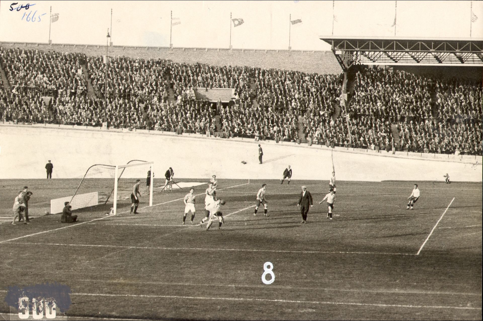 Persfoto Olympische Zomerspelen 1928 Amsterdam: overzicht over de wedstrijd tussen Nederland en Uruguay | Algemeen Fotobureau (Ltd.) Amsterdam 1928 via NOC*NSF op Collectie Gelderland
