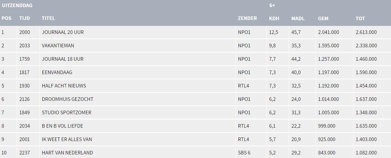 Kijkcijfers zijn vanaf eind augustus niet meer de dag erna in te zien. Het kijkonderzoek gaat op de schop vanwege de veranderende manier van televisiekijken. Er wordt in toenemende mate uitgesteld gekeken en via meer apparaten, schermen en platformen. Pas zes dagen na de uitzending worden de kijkcijfers gepubliceerd, meldt het Nationaal Media Onderzoek (NMO), verantwoordelijk voor de tv-meting.