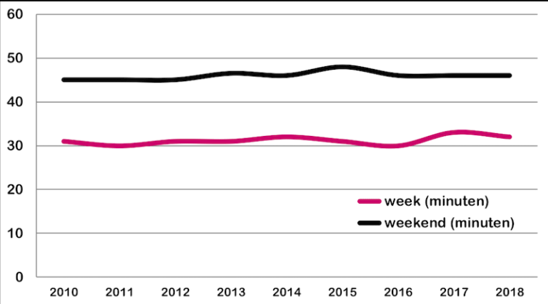 Het aantal lezers van papieren kranten neemt af, maar de leesduur is de afgelopen jaren stabiel, becijferde onderzoeker Piet Bakker op basis van gegevens uit jaarverslagen en NOM Print Monitor. De weekendkrant mag zich in de meeste leestijd verheugen; verder trekken vooral oudere lezers meer tijd uit voor de krant.