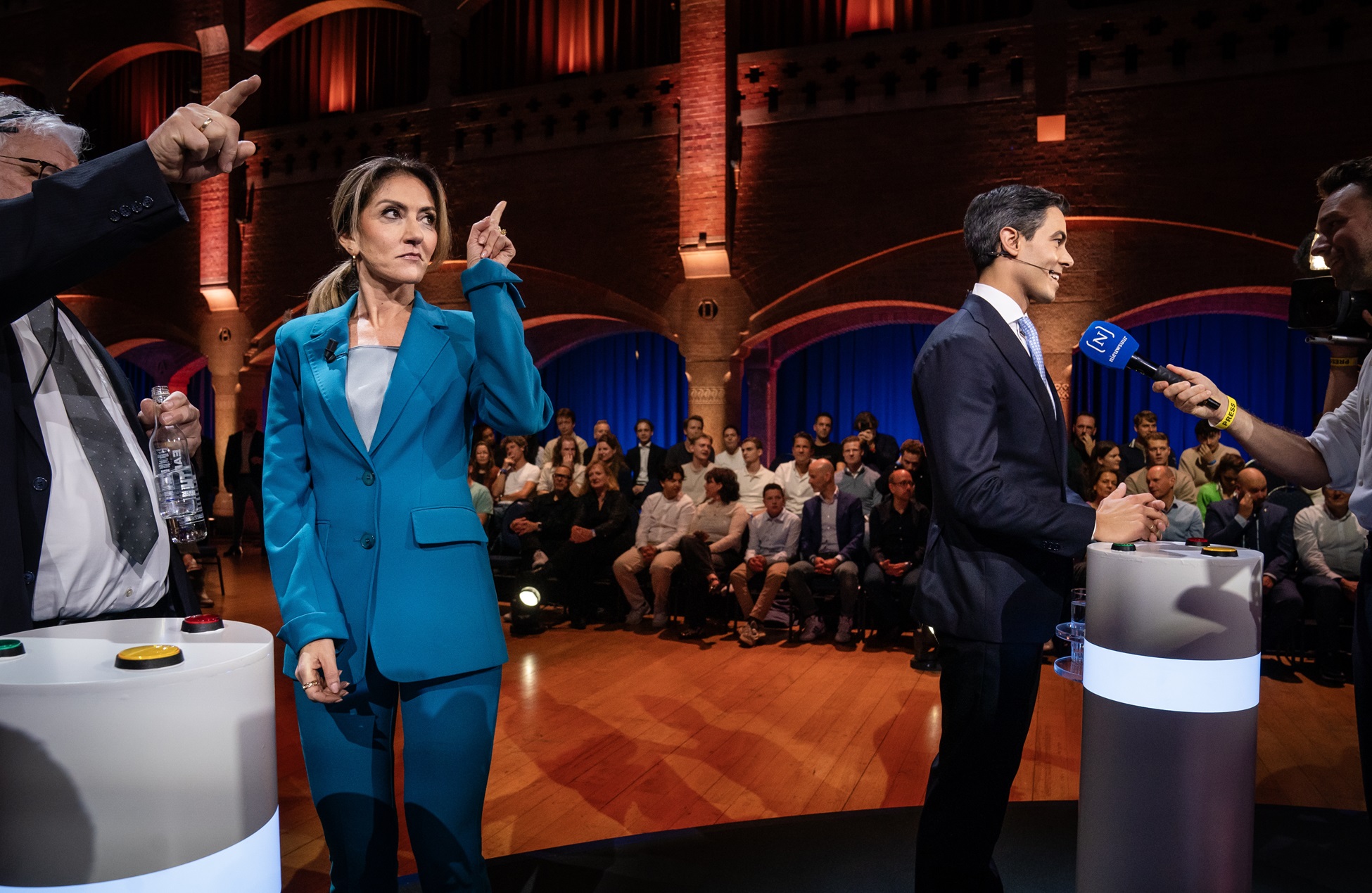 Dilan Yesilgoz (VVD) en Rob Jetten (D66) voorafgaand aan het eerste RTL verkiezingsdebat in de Beurs van Berlage in Amsterdam. - © ANP / Bart Maat