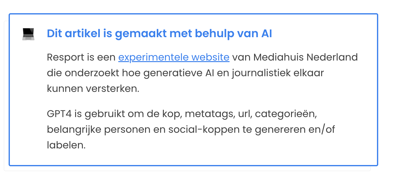 Resport.nl is zo ontwikkeld dat artikelen live kunnen zonder tussenkomt van de mens, zegt Amarins de Boer, Head of Content van Mediahuis in het persbericht. ‘Om de volledige betrouwbaarheid van de website te kunnen waarborgen, worden er dagelijks checks uitgevoerd door ervaren redacteuren. Daarnaast staat er onder ieder artikel wat er door AI is gegenereerd. Als een redacteur na publicatie iets aanpast, bijvoorbeeld de kop, zul je dat ook terugvinden onderaan het artikel.’