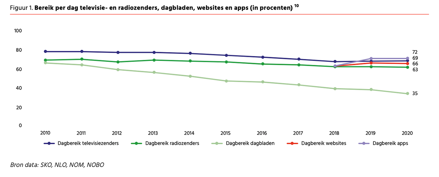 “Jongeren tot 34 jaar kijken steeds minder lineair televisie. Van de totale tijd die ze achter het televisiescherm doorbrengen, wordt nog maar 50 tot 60 procent aan lineaire televisie besteed. Ook de luistertijd en het bereik van radiozenders daalt in de groep van 50 jaar en jonger, terwijl het over alle Nederlanders behoorlijk stabiel is of zelfs groeit”, aldus de onderzoekers.