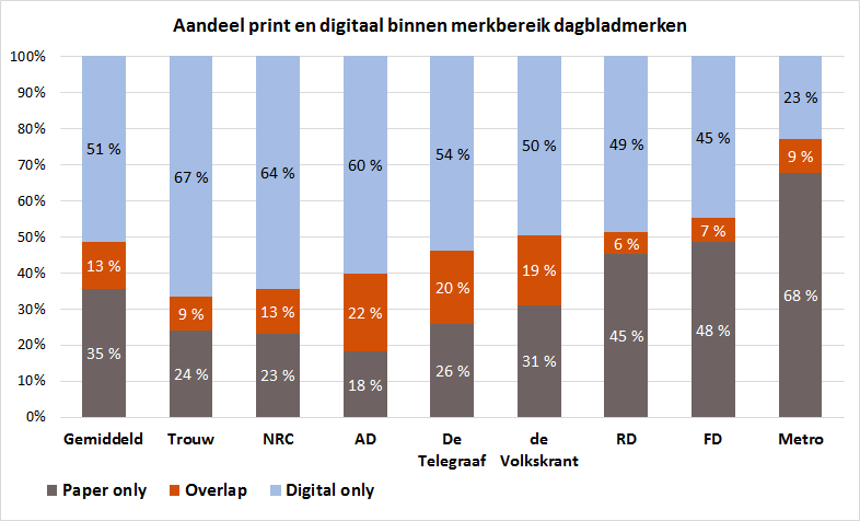 “Trouw en NRC hebben op maandbasis relatief het grootste aantal digital only-lezers. Twee op drie lezers laten zich op deze wijze door deze nieuwsmerken bedienen. AD heeft de grootste groep crossmediale lezers (22 procent) die het mediamerk zowel digitaal als in print volgen. Voor Metro blijft de gedrukte uitgave het belangrijkste kanaal naar de lezers. Ruim driekwart van het bereik komt dankzij de krant tot stand”, stelt NDP Nieuwsmedia.