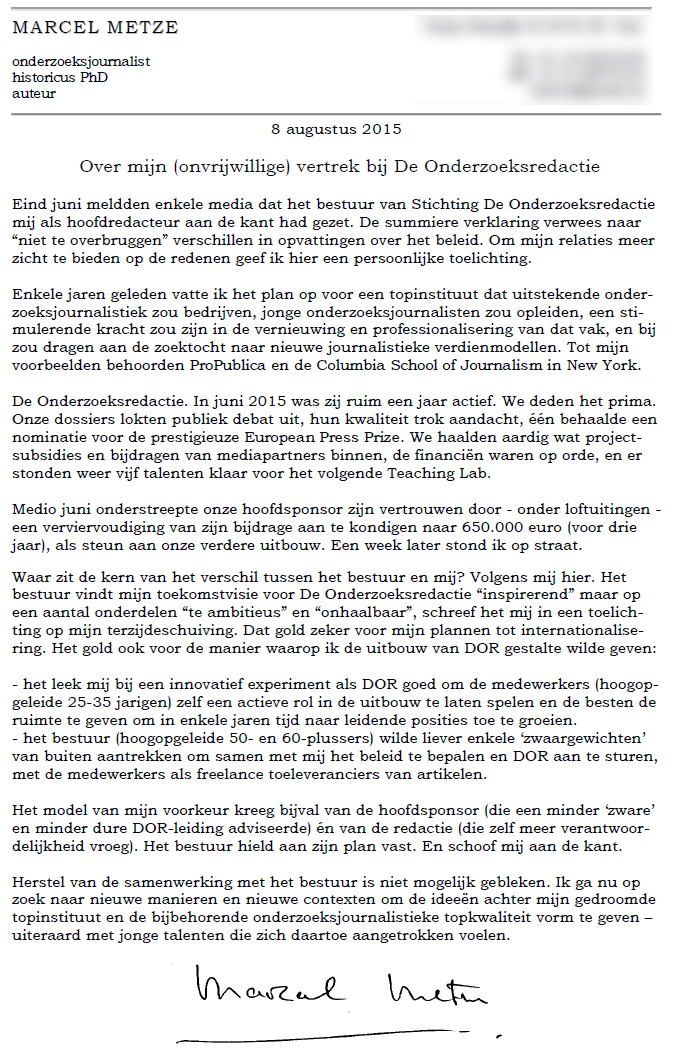 Marcel Metze, oud-hoofdredacteur van De Onderzoeksredactie (DOR), heeft een toelichting uitgegeven op zijn onvrijwillige vertrek in juni. Metze werd eind juni door het bestuur van de stichting aan de kant gezet. Metze zegt een aanvulling nodig te vinden op het summiere bericht dat er "verschillen van inzicht" bestonden over het te voeren beleid.