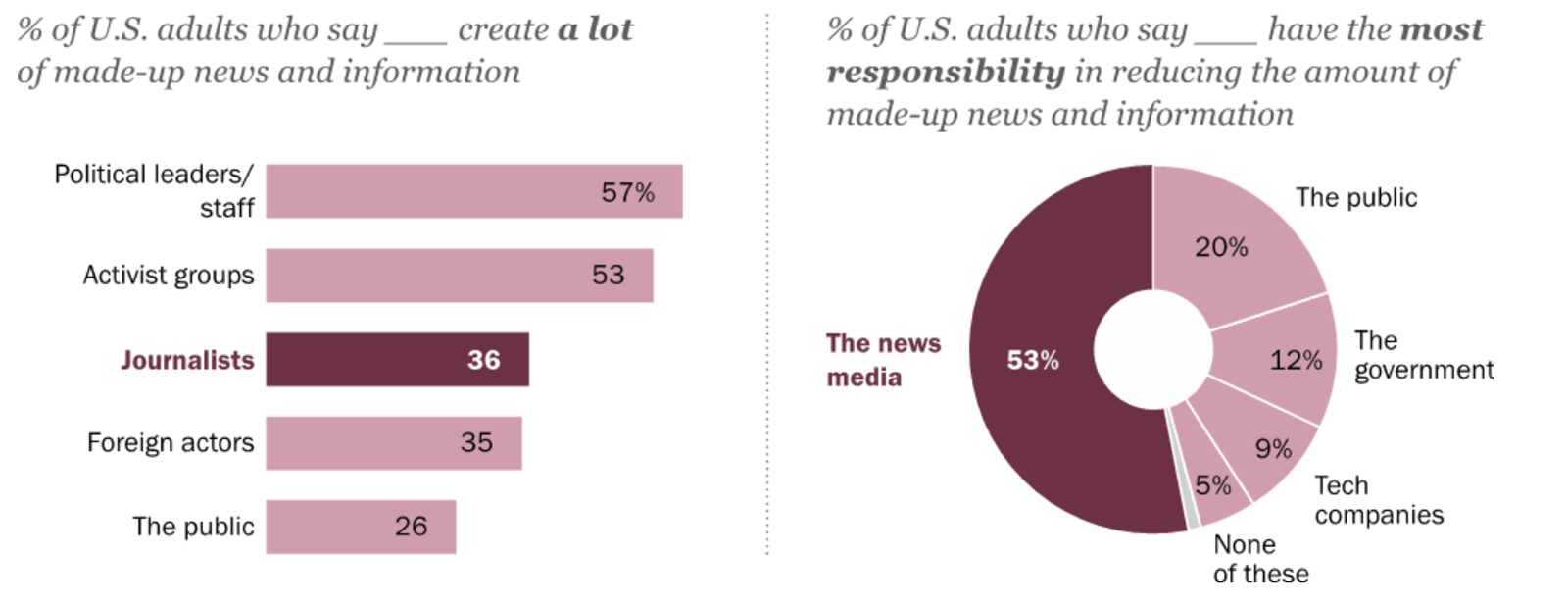 Democraten en Republikeinse aanhangers hebben weinig vertrouwen in hun wederzijdse nieuwsbronnen. Republikeinen zien meer nepnieuws en vinden bovendien dat journalisten het meest aan nepnieuwsproductie doen.