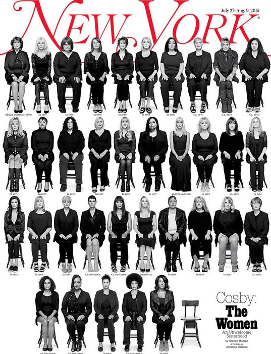 Het Amerikaanse tijdschrift New York Magazine publiceerde afgelopen maandag een sterke cover met daarop 35 vrouwen die claimen dat zij slachtoffer zijn van aanranding of verkrachting door Bill Cosby. De vrouwen werden onafhankelijk van elkaar geïnterviewd door het blad. Elf vrouwen wilden niet meewerken. De laatste stoel op de cover is leeg: voor de vrouwen die nog in de openbaarheid moeten treden met hun verhaal omtrent Cosby. De cover wordt door Jaap Biemans van Coverjunkie getipt voor Cover van het Jaar en hoort bij de topcovers van 2015. Meer bij het AD / New York Magazine