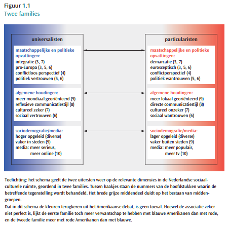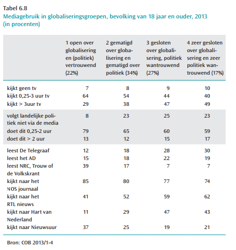 Het rapport beschrijft een Nederland dat bestaat uit hoger opgeleiden versus lager opgeleiden met een flink grijs middengebied. Wat mediaconsumptie betreft, lezen hoger opgeleiden kranten als NRC en Volkskrant en kijken naar de publieke omroep. Lager opgeleiden lezen Telegraaf en AD en kijken vaker naar de commerciële omroepen.