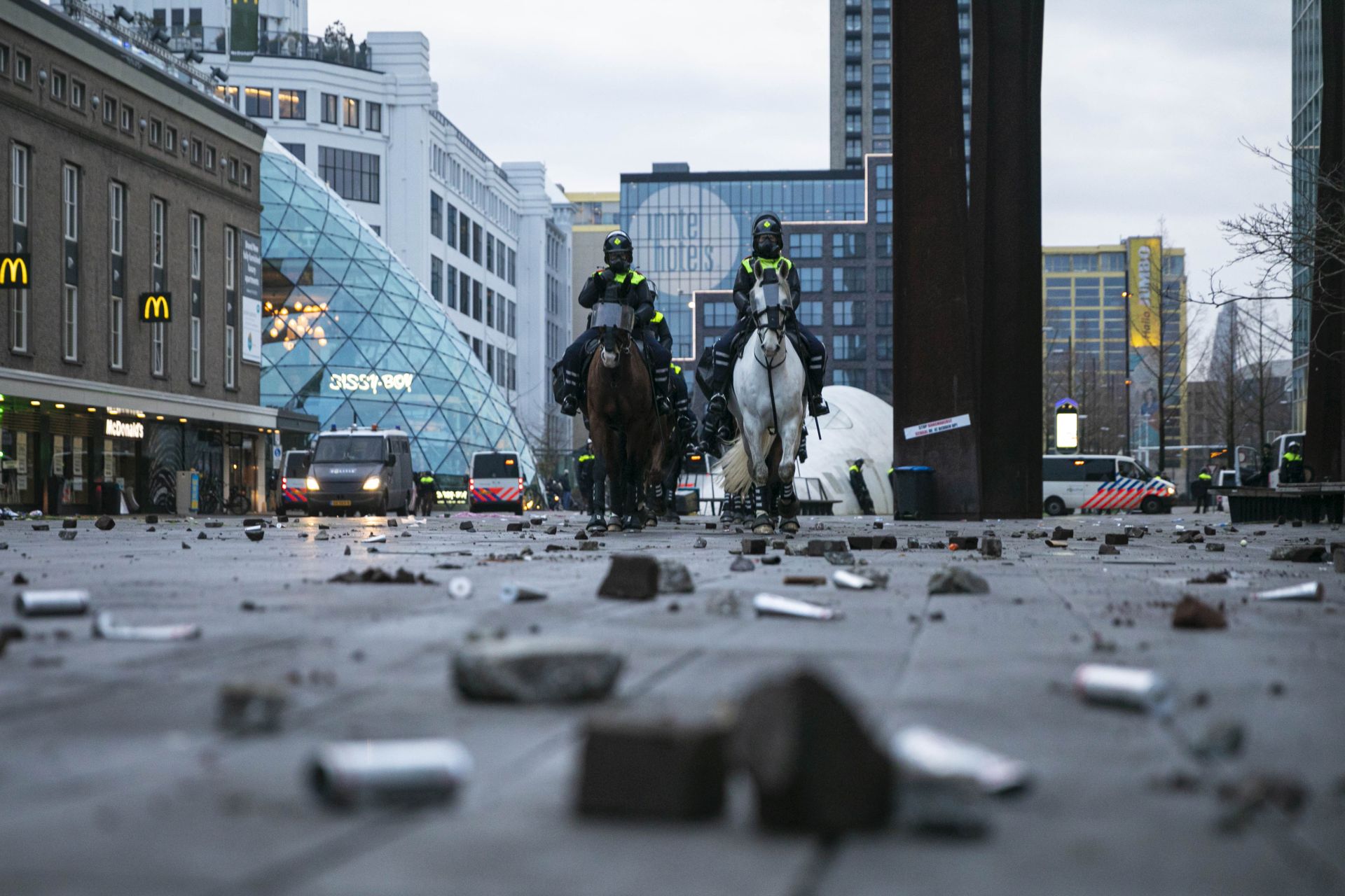 En in Eindhoven probeerde verslaggever Jan Peels van Omroep Brabant zijn cameraman veilig te houden, vertelt hij bij Op1. “Want die staat natuurlijk door zijn camera te kijken en die ziet al die stenen die door de lucht komen niet aankomen, dus af en toe heb ik hem wel naar achteren moeten trekken.”