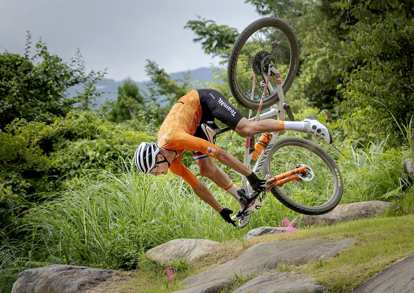 “Ik trok mijn toestel mee en keek daarna weer naar rechts, waar weer een renner in oranje aankwam. Plotseling hoorde ik oh’s en ah’s. Pas toen hij op de grond lag, dacht ik: ‘Jee, dat is Mathieu van der Poel’. Weg medaillekansen, daarvoor waren we gekomen. Ik heb meteen mijn foto’s midden in de Nederlandse nacht naar de redactie van het ANP gestuurd, want dit was een bijzonder beeld. Ik had de mazzel dat ik de goede plek had gekozen, op mijn foto’s zie je zijn gezicht, bij veel andere foto’s alleen zijn helm.”