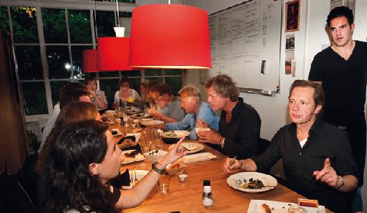 Rond dit tijdstip is het een komen en gaan van gasten voor DWDD en Holland Sport, dat hier ook live vandaan komt. De terrassen zitten vol. In het Mediacafé zelf – een kruip-door-sluipdoor- gebouw met veel trappetjes, gangetjes en onverwachte verhogingen – duwen door elkaar heen lopende programmacrews van DutchView dolly’s van de ene studio naar de andere. In de gangen van deze bijenkorf vind je verdwaalde studiostoelen, snoeren en mengtafels. Een draaiboek ‘Pauw & Witteman’ met handgeschreven aantekeningen dwarrelt over de grond. Er wordt gegeten in een kamer naast de redactie.