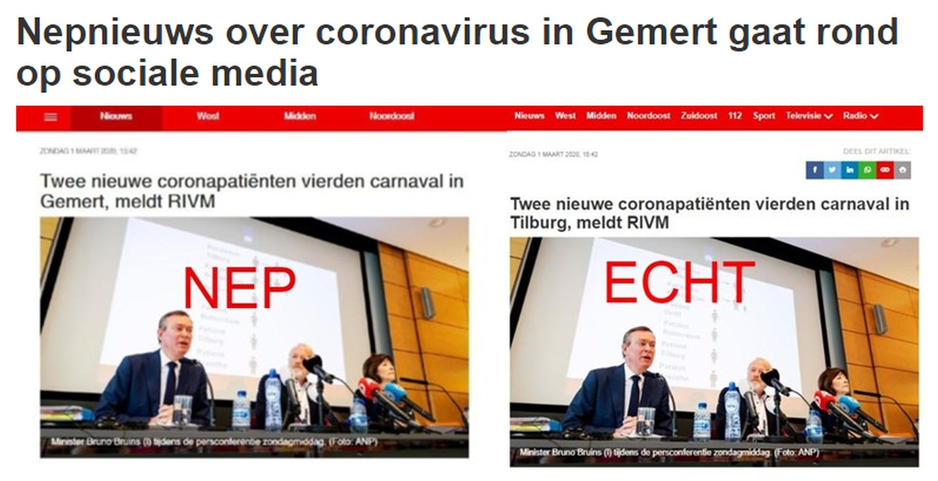 Zondagmiddag plaatste de omroep het bericht dat twee nieuwe coronapatiënten carnaval vierden in Tilburg. Dat artikel is gebruikt als bron voor het nepbericht, meldt Omroep Brabant. In het nepbericht staat dat dat twee coronapatiënten uit Gemert en het Limburgse Venray carnaval zouden hebben gevierd in Gemert.