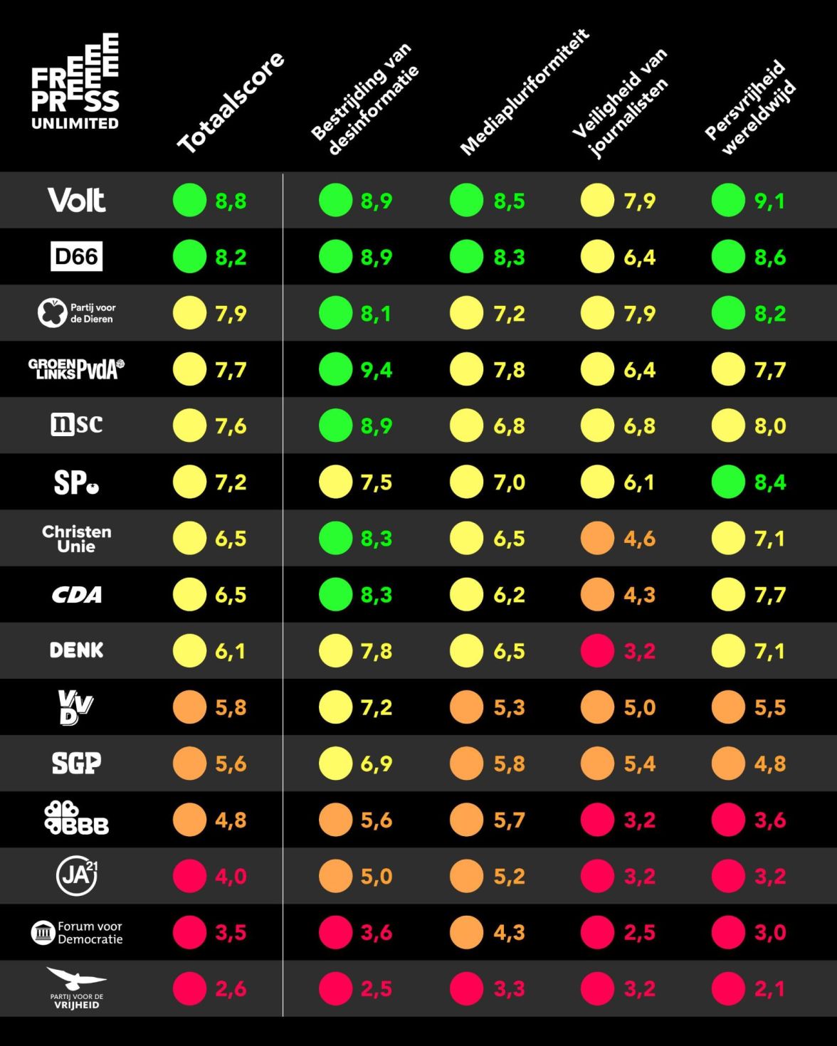 Volt scoort het hoogst op het gebied van persvrijheid, gevolgd door D66, PvdD en GroenLinks-PvdA. PVV heeft de laagste score. Dat meldt Free Press Unlimited donderdag op basis van eigen onderzoek naar partijprogramma's, ingediende moties en stemgedrag.