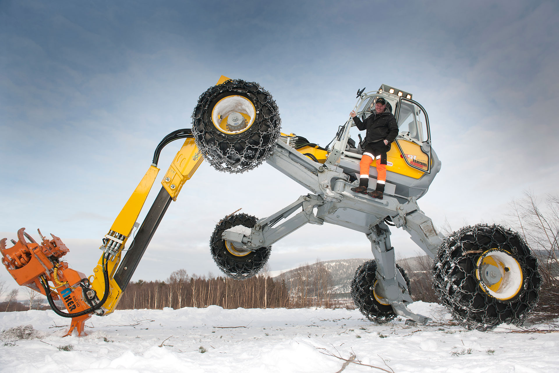 Niet dat er nooit iets in zijn leven veranderd. Pasveer woonde al geruime tijd met zijn vrouw en zijn gezin in Lochem, toen ze op een dag besloten voor het avontuur te kiezen. Rustig, handen rond een mok koffie: ‘We hadden zin in iets anders, het was tijd om te verkassen. Noorwegen leek ons wel wat.’ De fotograaf zegde zijn vaste baan bij Reed Elsevier op, waarna ze in 2004 uit Nederland vertrokken. Het begin was zwaar, ze zaten niet op hem te wachten. In Noorwegen was hij een nobody. Maar via via legde hij contacten. Noorse landbouwbladen ontdekten zijn talent en in Nederland bleef De Boerderij hem trouw. De vlakke Hollandse weilanden werden uitgebreid met Noorse bergen en bossen. Hij leerde er geleedpotige kniktractoren kennen, die geen helling schuwen. En ging er houden van die typisch Noorse geur, een verleidelijk mengsel van hars, naalden en zaagsel, dat vrijkomt na het vellen van bomen.