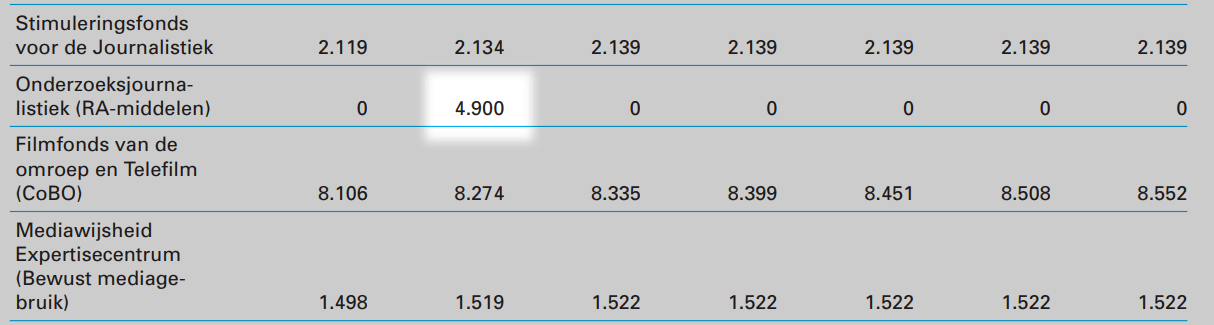 Het budget van 5 miljoen (minus een ton aan uitvoeringskosten) dat voor onderzoeksjournalistieke projecten is vrijgemaakt, was ook al bekend. Het is vooralsnog wel een eenmalige gebeurtenis, blijkt uit de cijfers: voor 2019 en verder is in de Rijksbegroting structureel geen euro voor onderzoeksjournalistiek gereserveerd. Dat is ook eerder aangekondigd. Als het proefjaar goed verloopt, komt het geld structureel beschikbaar.