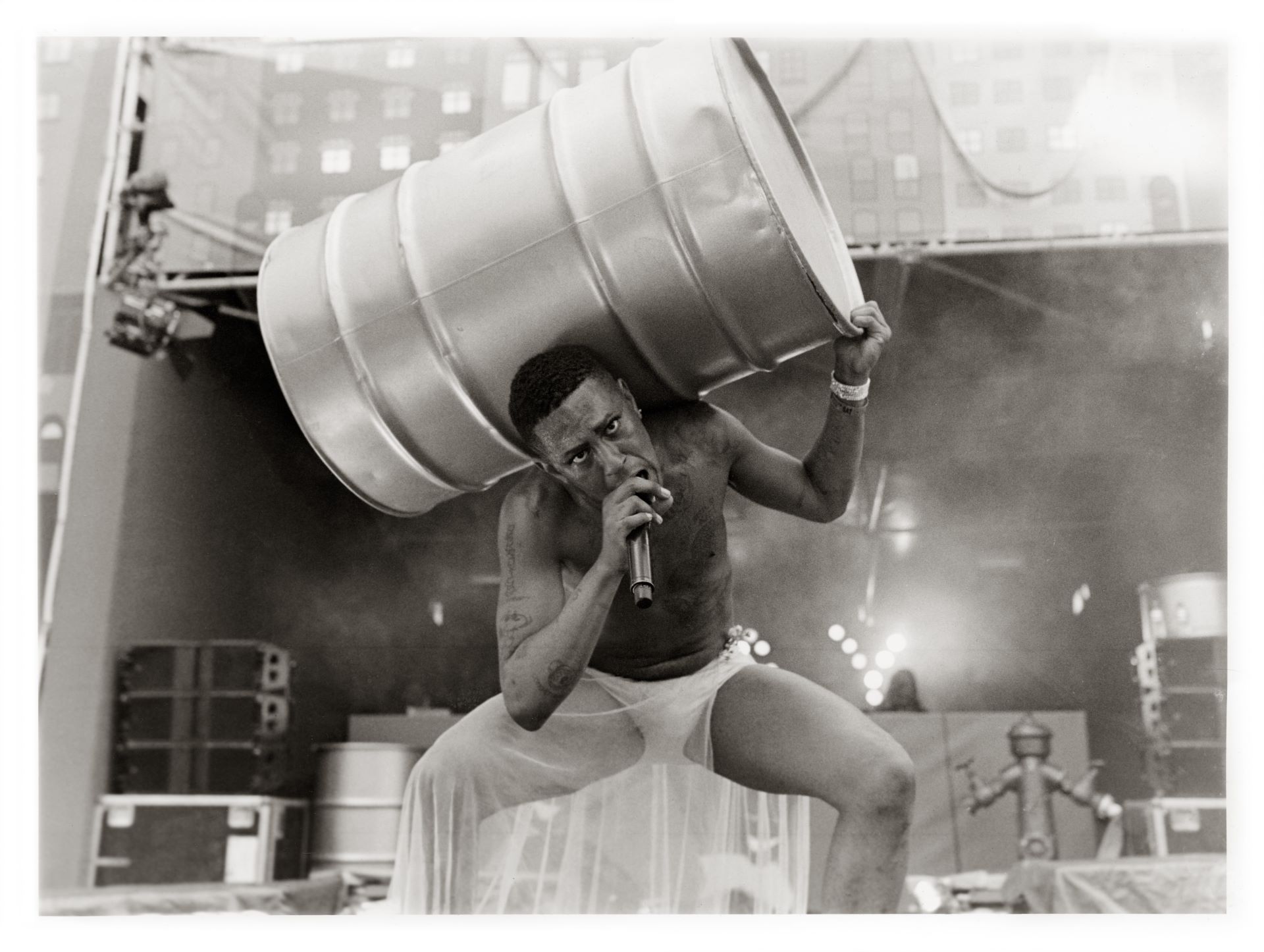 ‘De foto die ik van hem maakte op het Milkshake Festival in 2016 is een van mijn favorieten. Mykki is een queer rasartiest en je ziet op de foto hoe hij helemaal opgaat in zijn eigen show. Aan de zijkant van het podium stond een groot olievat dat hij tijdens zijn show opeens oppakte en boven zijn hoofd hield. Die dag schoot ik analoog en dan kun je geen eindeloze rij foto’s maken. Als ik analoog fotografeer kijk ik heel geconcentreerd naar alles wat er gaande is. Wanneer ik het juiste moment aan voel komen, sta ik klaar. Want als er iets gebeurt op een podium moet ik toeslaan. Ik ben er trots op dat ik die momenten zelden mis.’