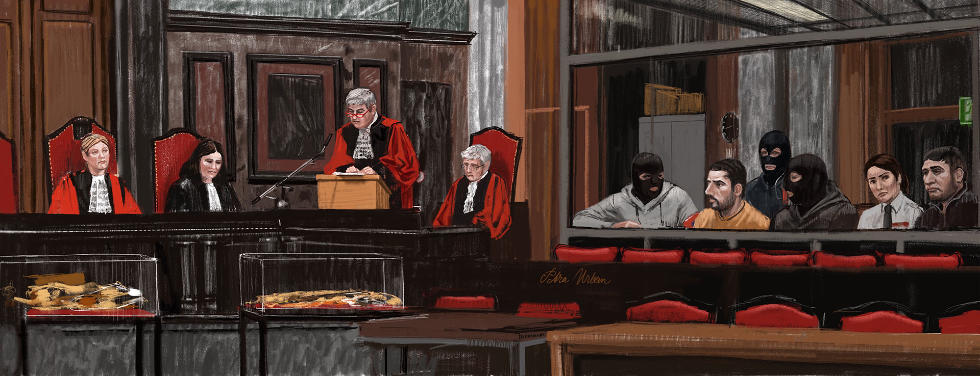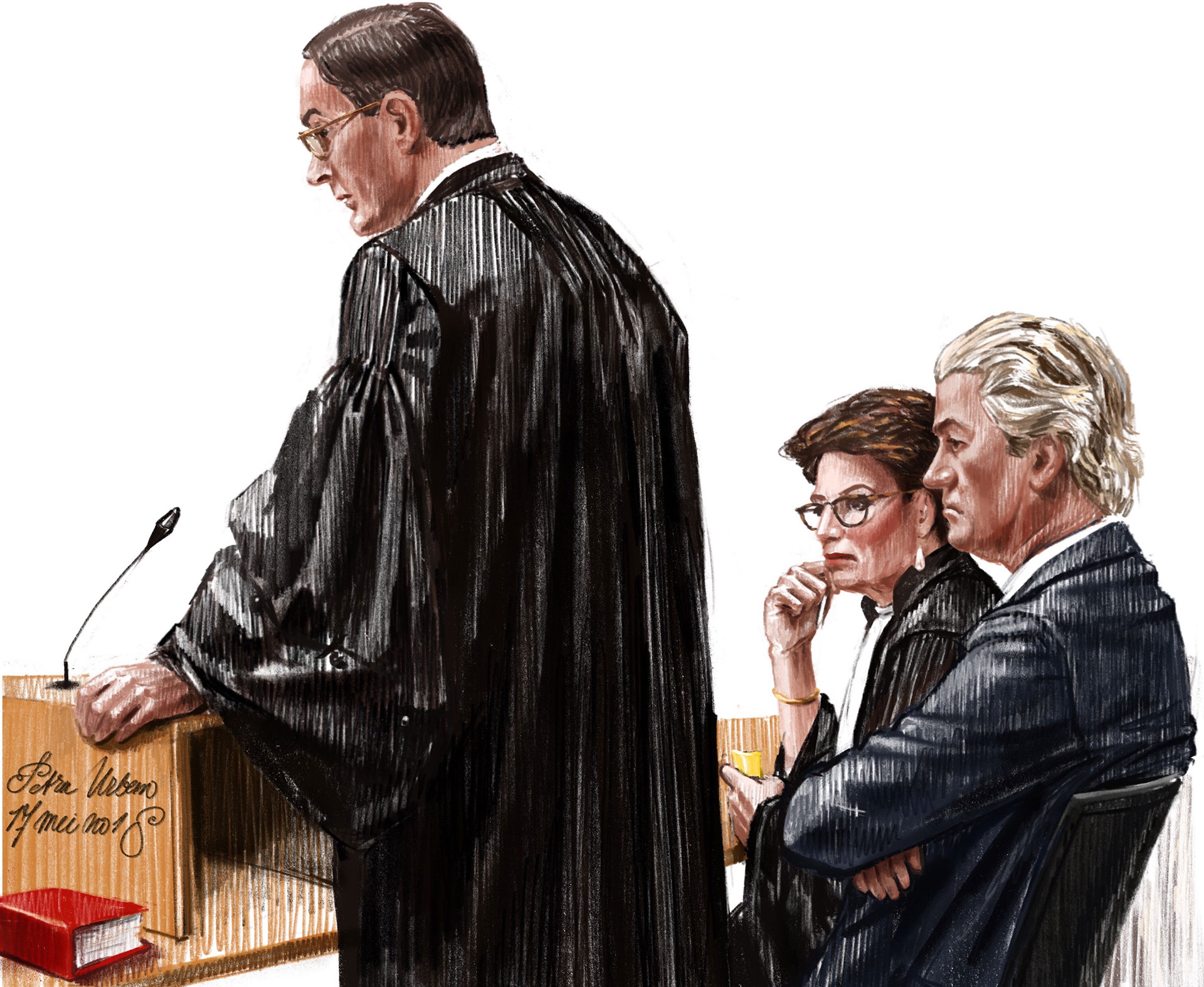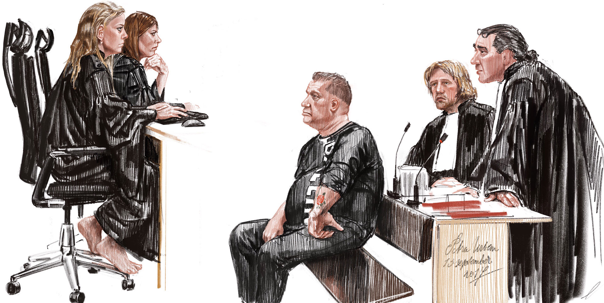 Haar rug was al kwetsbaar, maar het lange en verkrampte zitten in rechtszalen heeft haar lichaam extra beproefd. Op de eerste dag van het proces kon ze nog aanwezig zijn, het leverde haar twee tekeningen en een schets op. Veel te weinig. Nu zit ze noodgedwongen thuis of bezoekt ze specialisten. ‘Ik moet het accepteren’, zegt ze op dappere toon, ‘maar dit soort processen zijn de krenten in de pap.’ In het vervolg van het gesprek doet ze over dit tere onderwerp een beroep op haar zwijgrecht.