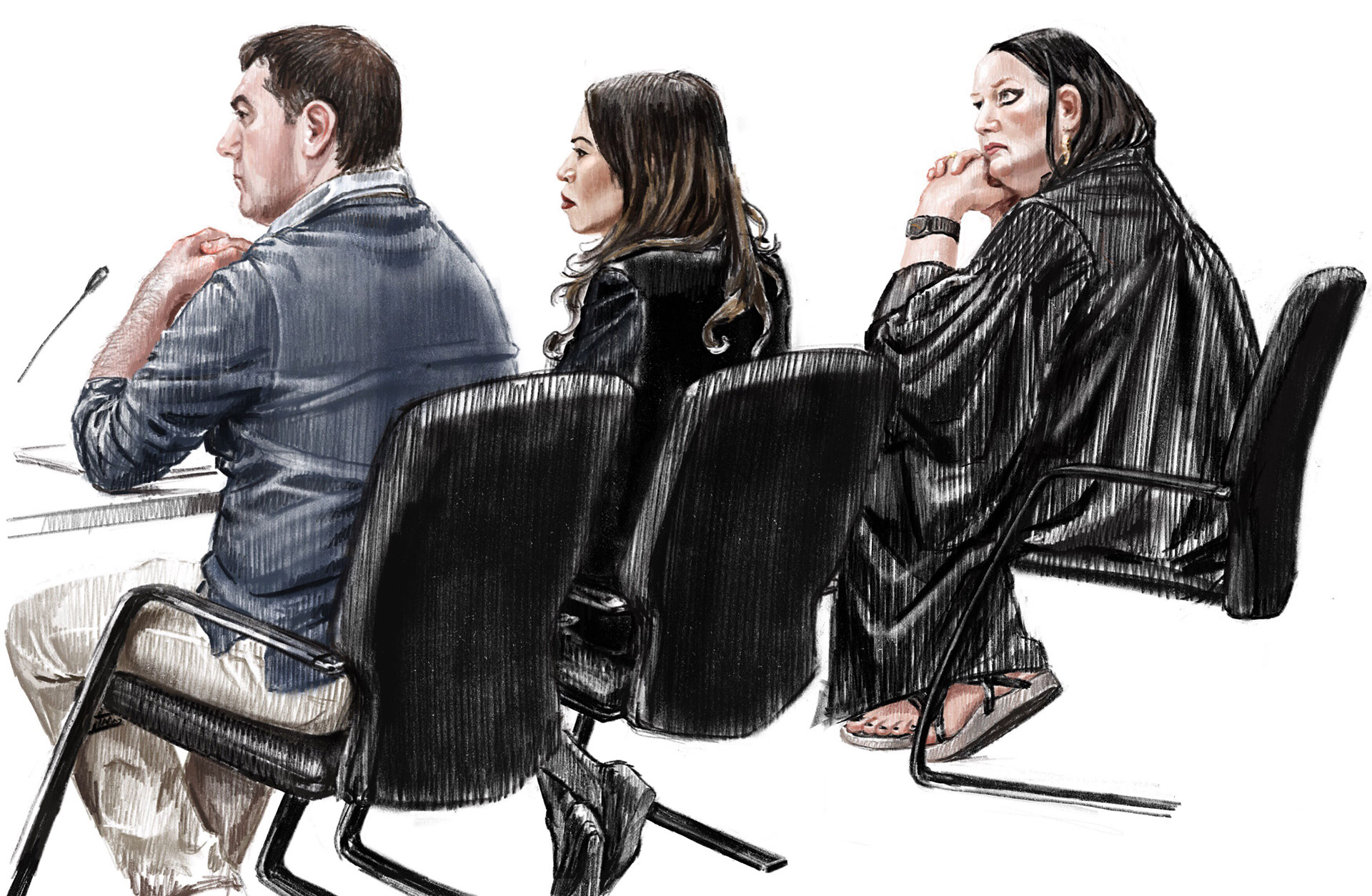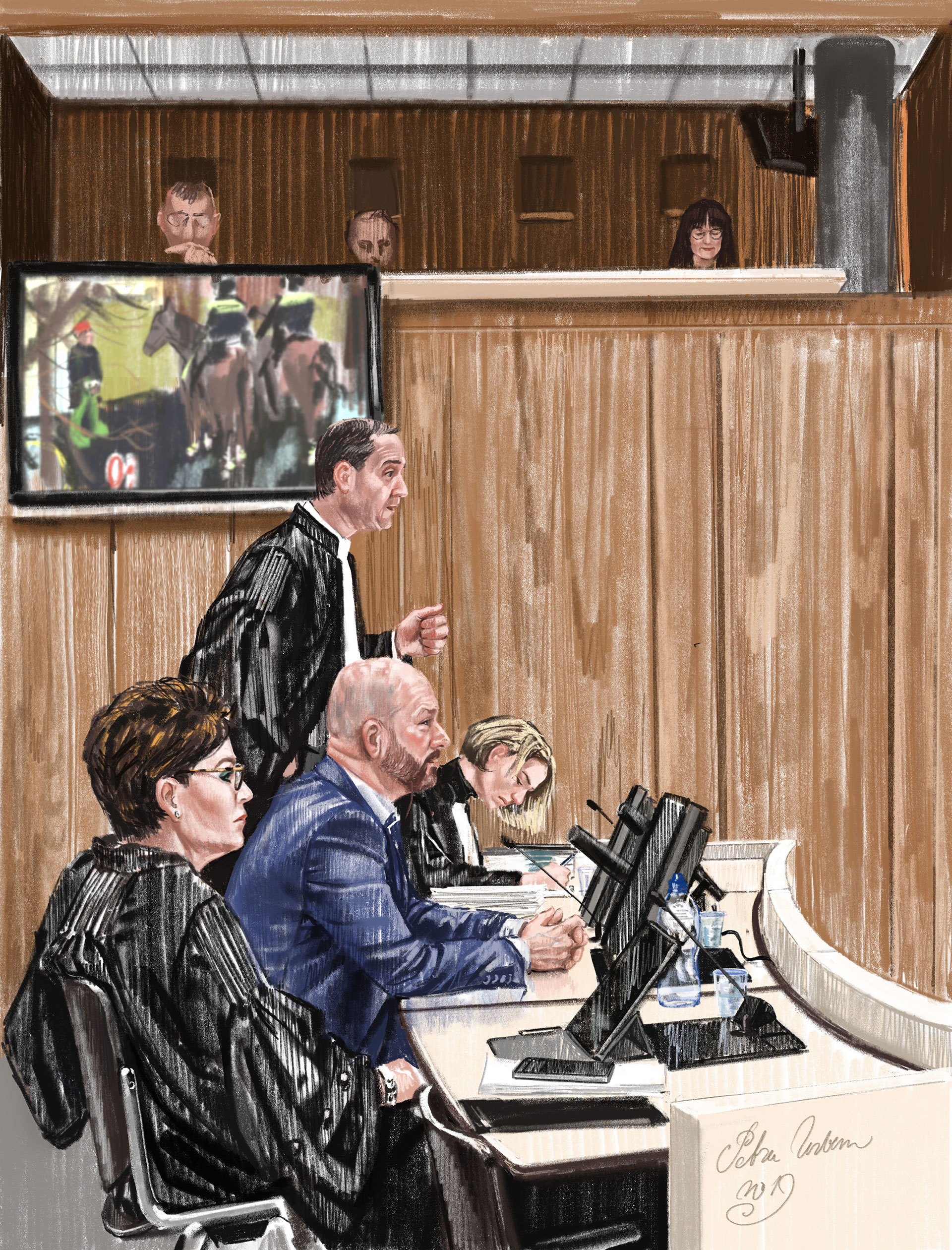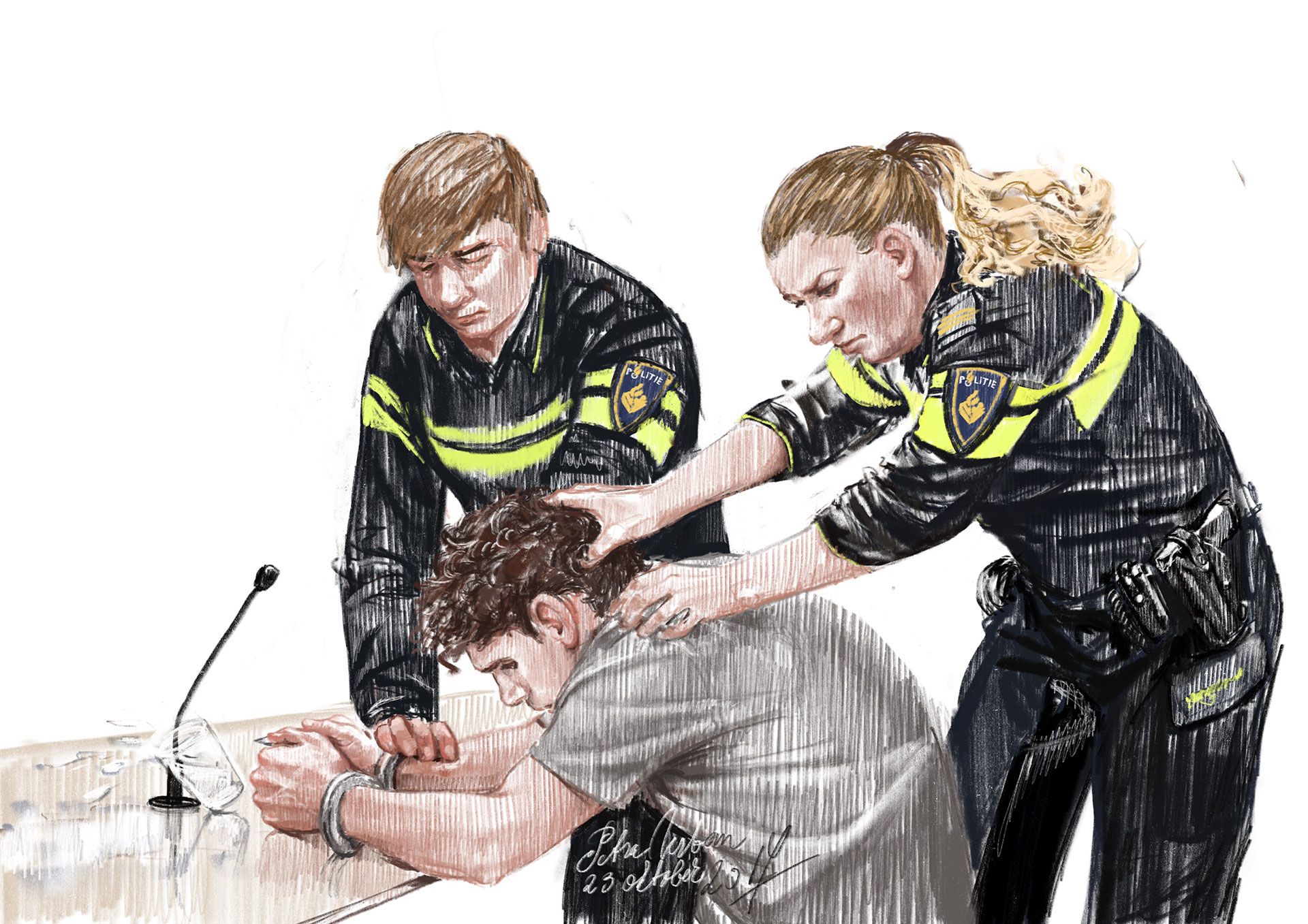 Haar rug was al kwetsbaar, maar het lange en verkrampte zitten in rechtszalen heeft haar lichaam extra beproefd. Op de eerste dag van het proces kon ze nog aanwezig zijn, het leverde haar twee tekeningen en een schets op. Veel te weinig. Nu zit ze noodgedwongen thuis of bezoekt ze specialisten. ‘Ik moet het accepteren’, zegt ze op dappere toon, ‘maar dit soort processen zijn de krenten in de pap.’ In het vervolg van het gesprek doet ze over dit tere onderwerp een beroep op haar zwijgrecht.