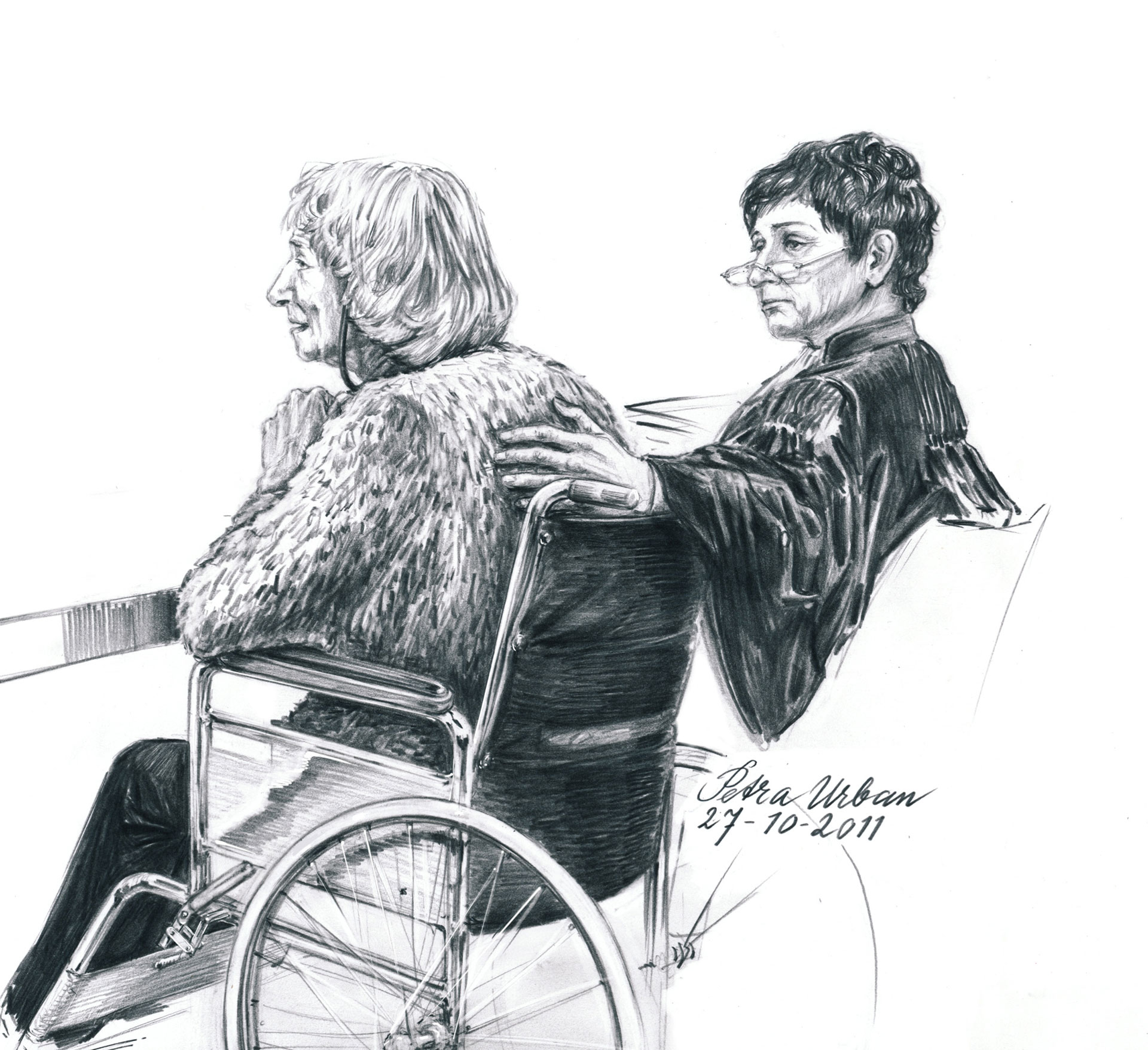 Op de tafel maakt poes Geertje zich geschrokken uit de voeten. Dochter Lucia komt nieuwsgierig kijken en volgt het tafereel vanaf de bank. Urban zoekt ter ontspanning de rugleuning van haar stoel. Ze noemt het voorbeeld van een dementerende vrouw die haar verstandelijk gehandicapte dochter ombracht. Het verhaal is schrijnend, de tekening maakt het eerlijker, betoogt ze, zeker als een advocaat een arm om de verdachte heenslaat. ‘Dát was het beeld’, zegt ze. ‘Het maakte de zaak ineens veel menselijker. Het komt dichtbij, ze had je oma kunnen zijn.’