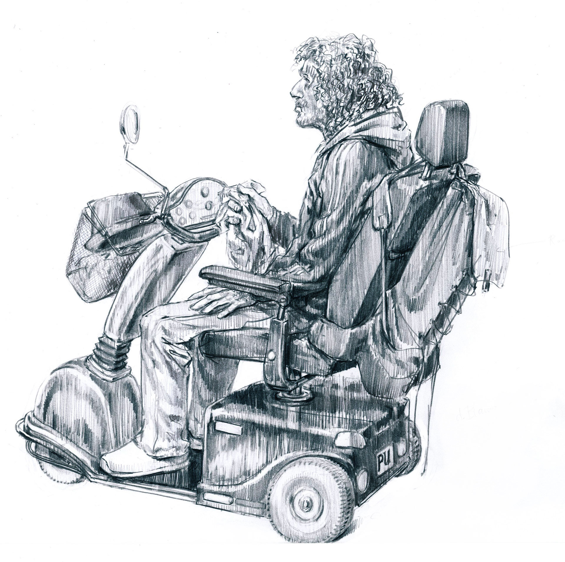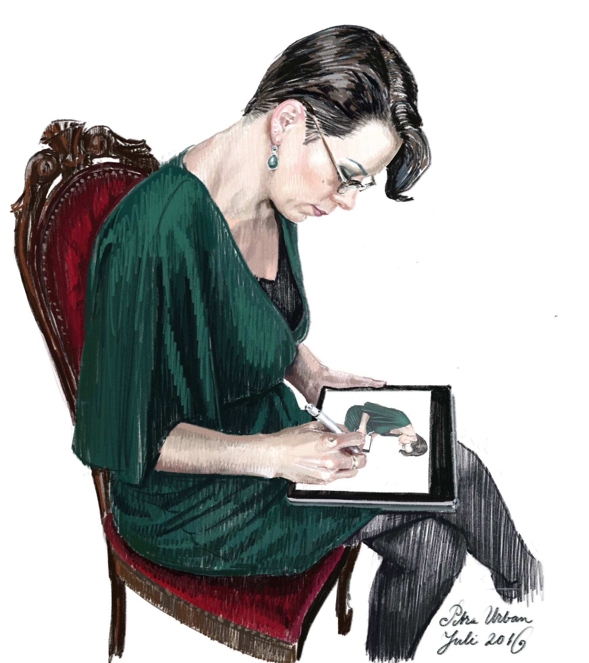 Een compact college volgt. ‘De mens is een constructie’, begint ze. Een wat? Urban lacht de onnozele vraag weg. Ze debiteert kennis die ze op de kunstacademie Minerva in Groningen in anatomische lessen heeft opgedaan. Geen lichaam of gezicht ontkomt aan haar scherpe observaties. Neus, oogopslag, houding, kleding, schaduwwerking, sfeer – alles is relevant. Ze neemt me aandachtig op terwijl ze het scherm van de iPad naar me toe draait. De pen beweegt rap over het glas. Haar ogen blijven gericht op het menselijk object vóór haar. ‘Ik zie nu een omhulsel van botten en spieren.’ Neuriënd beschrijft ze haar handelingen: ‘Daar is je neus, zo staan de ogen, kijk die interessante lijn die daar zomaar wegloopt!’ Urban schetst me binnen een minuut. Vanachter haar iPad, ondersteboven.