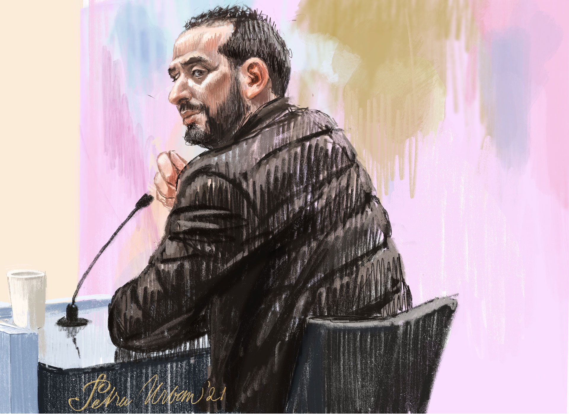 Corona heeft het werken nog moeilijker gemaakt. Kijken vanuit onmogelijke posities werd een opgave. Haar lichaam wrong zich in bochten om verdachten te kunnen observeren. Er zijn plastic schermen geplaatst, net als zitplaatsen achterin de zaal, waardoor de afstand tot de betrokkenen zelfs voor een geoefende tekenaar bijna onoverbrugbaar is. Urban besloot bij een antiekhandelaar een bijzondere aanschaf te doen. Met een ouderwetse toneelkijker tuurt ze voortaan naar het gerechtelijke schouwspel. ‘Alleen scherpstellen, inzoomen kan niet’, zegt ze lachend over haar vondst. ‘Zonder dat ding had ik helemaal niet kunnen tekenen.’