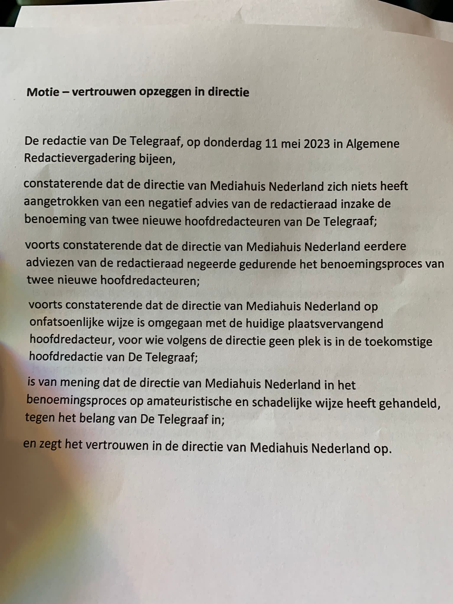 Tegen deze benoeming was eerder al verzet gerezen: ‘De directie van Media Huis Nederland heeft zich niets aangetrokken van een negatief advies inzake de benoeming van twee nieuwe hoofdredacteuren’, schrijft de redactie in een motie.