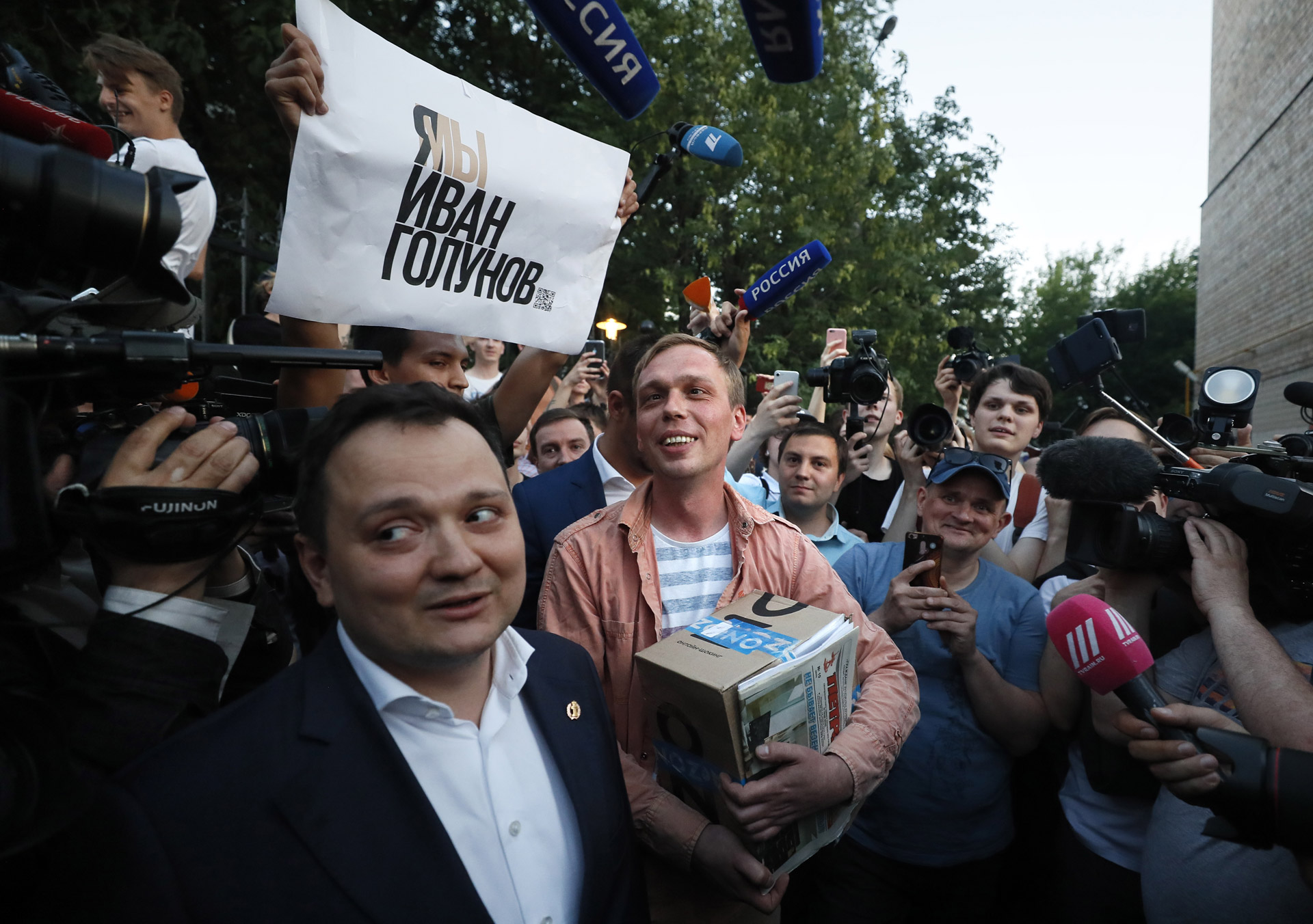 Het niet eerder vertoonde massale protest tegen de arrestatie van de Russische onderzoeksjournalist Ivan Goloenov leidde gisteren al tot zijn vrijlating; nu is ook de hele zaak tegen hem geseponeerd. Goloenov wachtte mogelijk twintig jaar cel, omdat de autoriteiten hem van drugshandel beschuldigden.