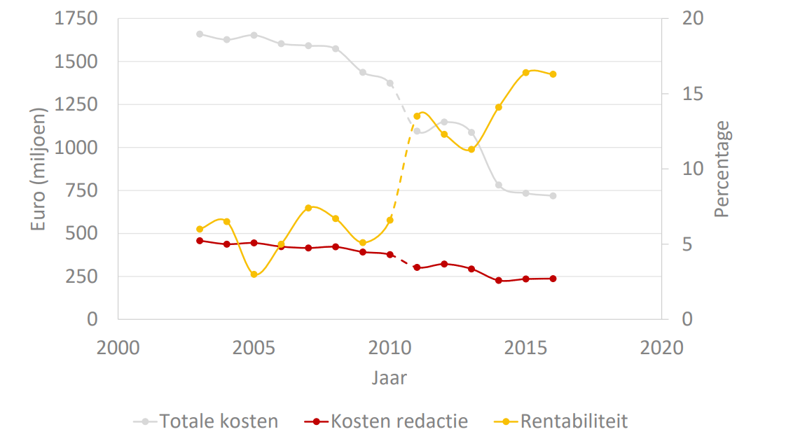 De afgelopen achttien jaar kenmerkten zich naast de eerder genoemde technologische effecten door een forse daling van kosten voor dagbladuitgevers. In 2003 gaven bij koepelorganisatie NDP Nieuwsmedia aangesloten dagbladen nog 1,6 miljard euro uit aan redactiekosten. In 2016 was dat meer dan gehalveerd naar 700 miljoen euro.