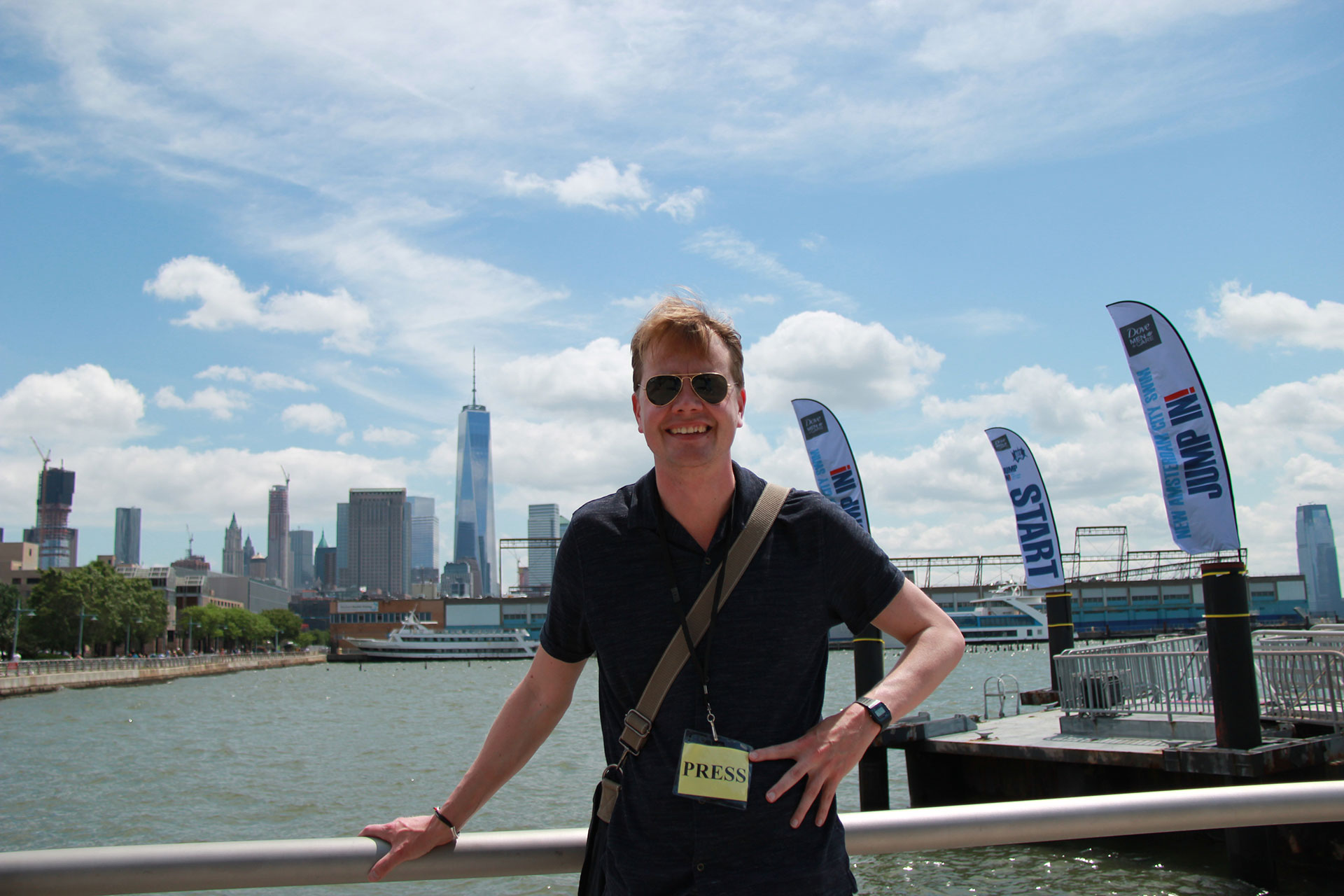 ‘Ik was daar op uitnodiging van Radio Veronica. De zender is mediapartner van de Amsterdam City Swim en was in die hoedanigheid uitgenodigd voor de New Amsterdam City Swim: vierhonderd mensen zwommen een mijl in de Hudson om geld op te halen voor de bestrijding van de zenuwziekte ALS. Ook twee Veronica-dj’s zwommen mee. Het was erg indrukwekkend om erbij aanwezig te zijn.’
