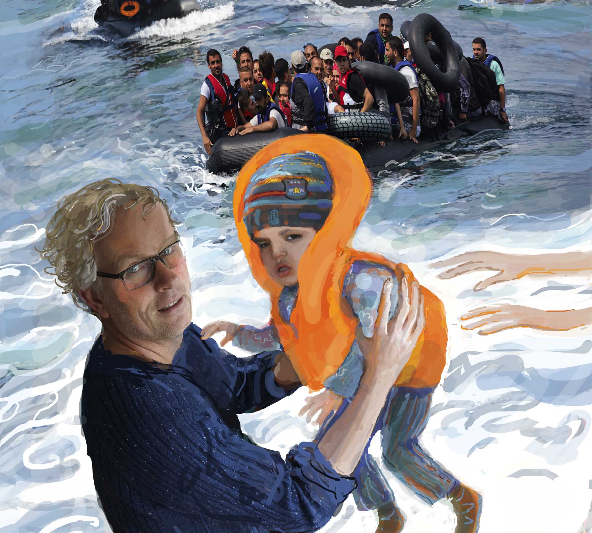 Ik ben later bijna drie weken terug geweest. Om mee te helpen. Op een dag stond ik op het strand bij Molyvos, in het noorden van Lesbos. Daarover schreef ik: ‘Drie weken geleden stonden we acht uur op de uitkijk voor een bootje uit Turkije. Vandaag 25 boten in anderhalf uur. Veel te weinig water en croissants in de kofferbak, veel te weinig plek op de achterbank. Wat een mooie mensen. Wat een bijzondere dag. Wat een gave baan.’