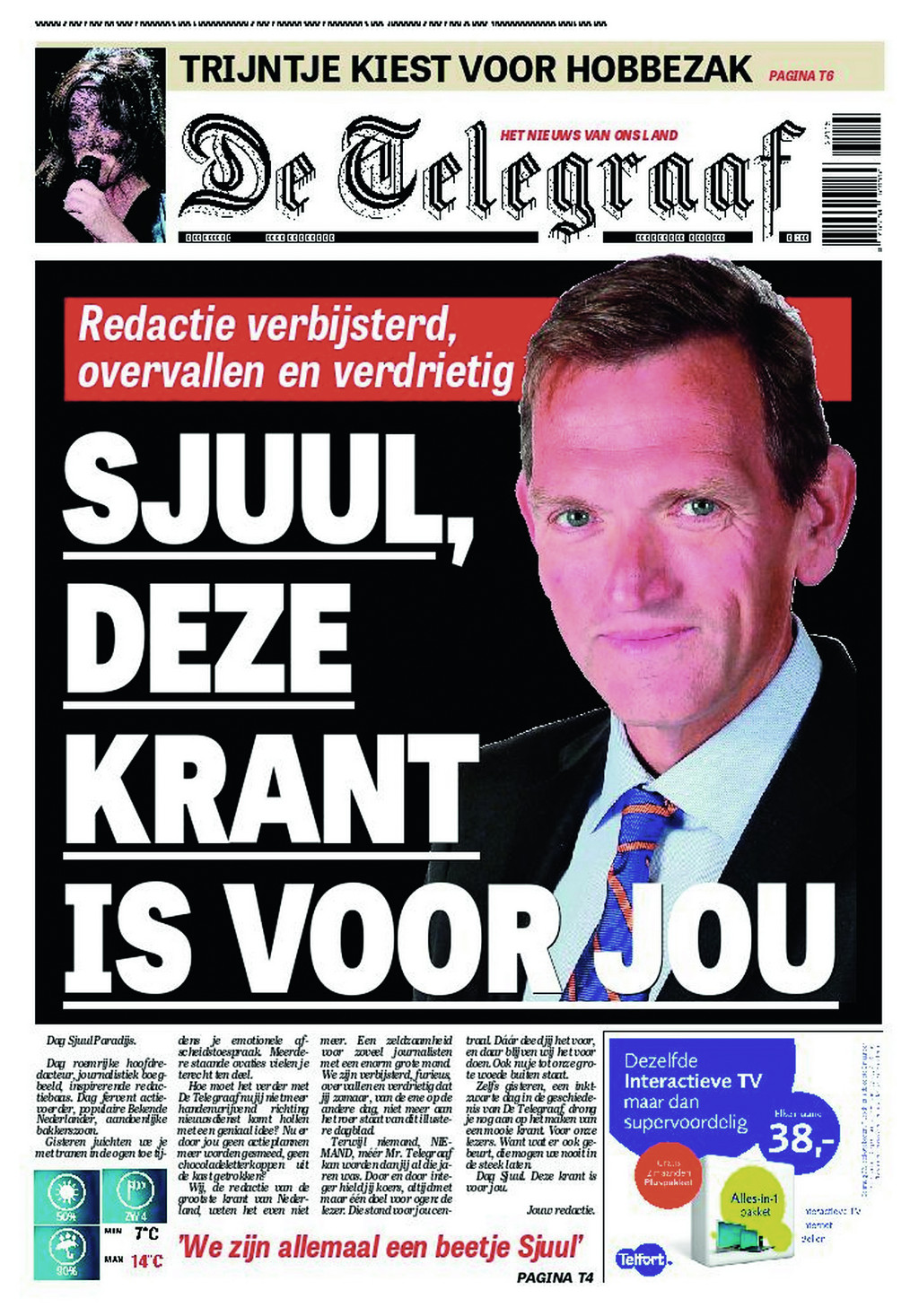 Van de Wetering wil alleen artikelen over Sjuul Paradijs aanbieden die je gelezen móet hebben. Hoe ga je te werk als je dagelijks een selectie moet maken uit alle artikelen over Sjuul Paradijs in De Telegraaf? Van de Wetering: ‘We selecteren vanuit ons breed journalistiek kader met een positief mensbeeld, waarbij de leidende vraag blijft: gaat het artikel over Sjuul Paradijs? Is het antwoord op die vraag ‘nee’ dan moet je hard zijn, ook al levert dat soms verhitte discussies op in de redactie.’
