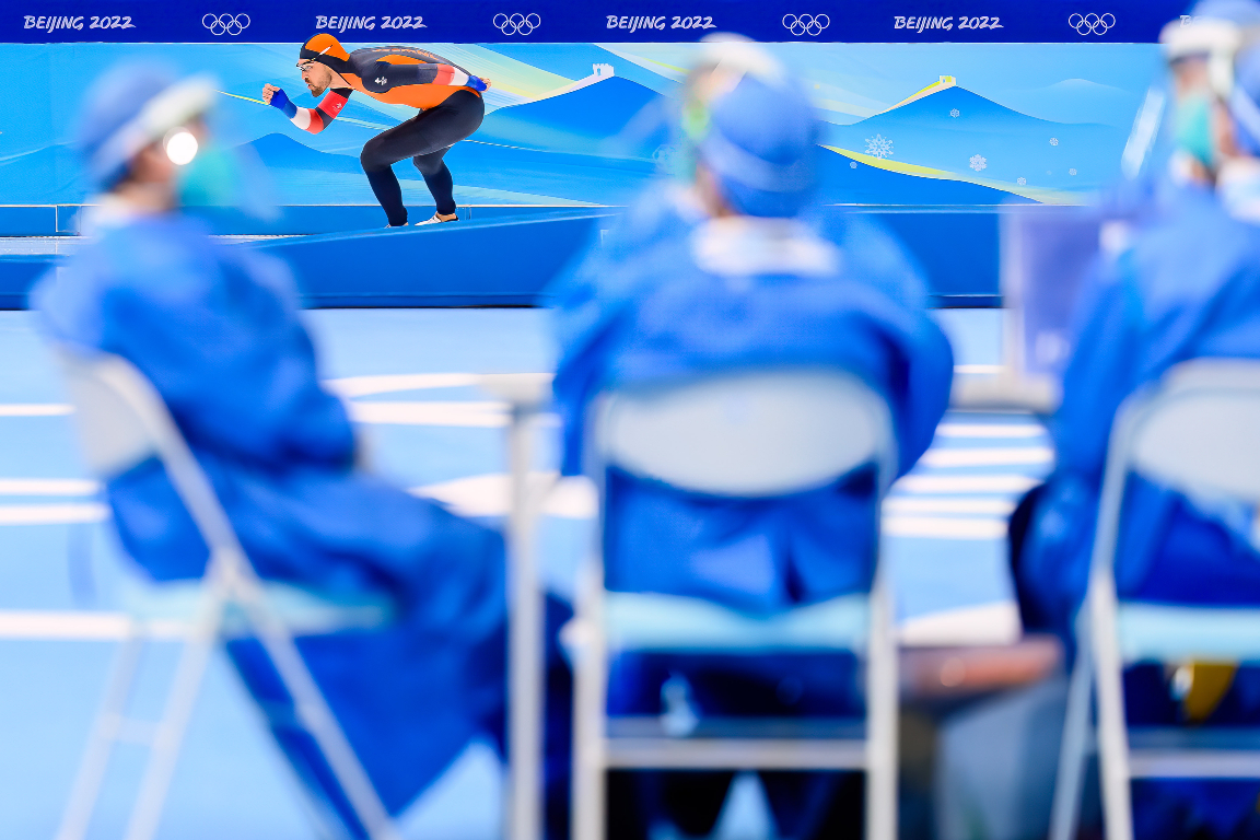 Kjeld Nuis tijdens zijn gouden race op de 1500 meter, nauwelijks gadegeslagen door Chinese officials in Covid-beschermende outfit (Foto Vincent Riemersma)
