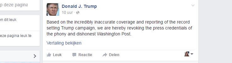 Verslaggevers van de Post vernamen dat nieuws gisteren via Trumps Facebookpagina. Wat de ban precies inhoudt, weten ze niet.