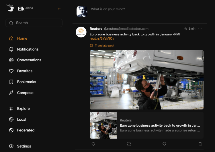Via Elk is de blik op Mastodon nauwelijks te onderscheiden van de Twitter-feed.