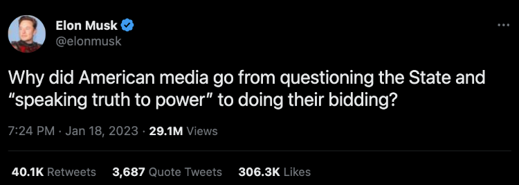 Zo laat Musk zelden een kans liggen voor verdachtmakingen richting individuele journalisten of media. Die zijn vooringenomen richting hem of zijn bedrijven, worden aangestuurd door linkse krachten of spannen samen met overheden.