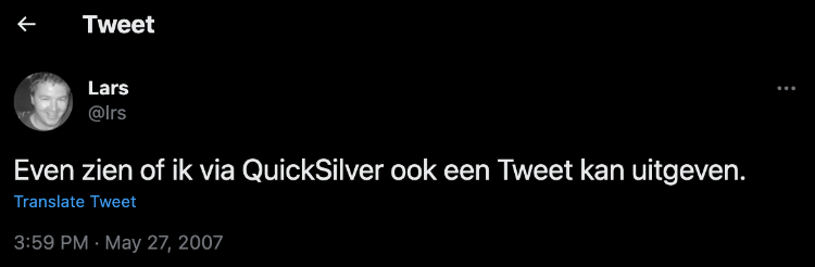 Mijn eerste tweet, in 2007 verstuurd via QuickSilver, een voorloper van de Spotlight-zoekmachine op OS X.