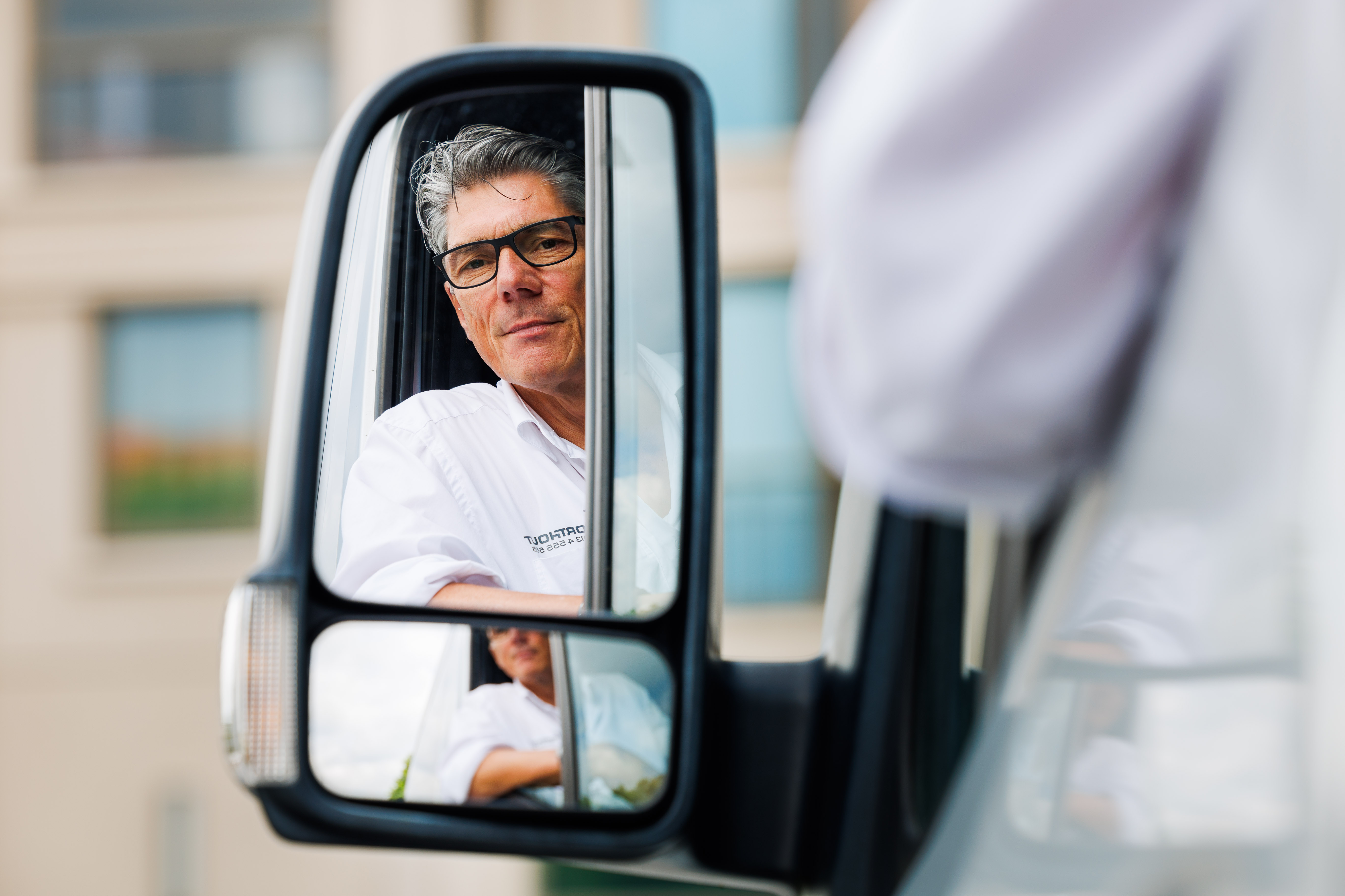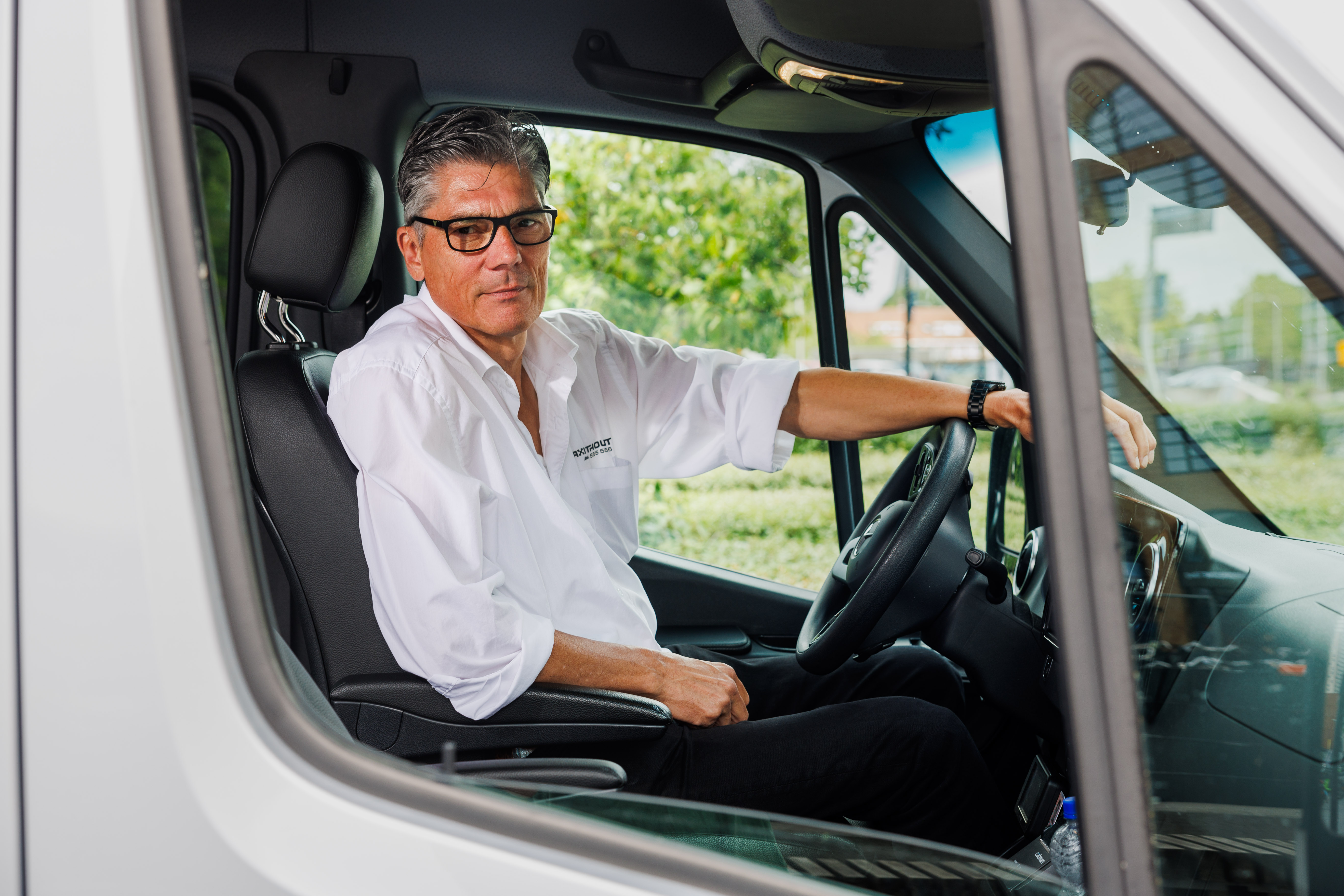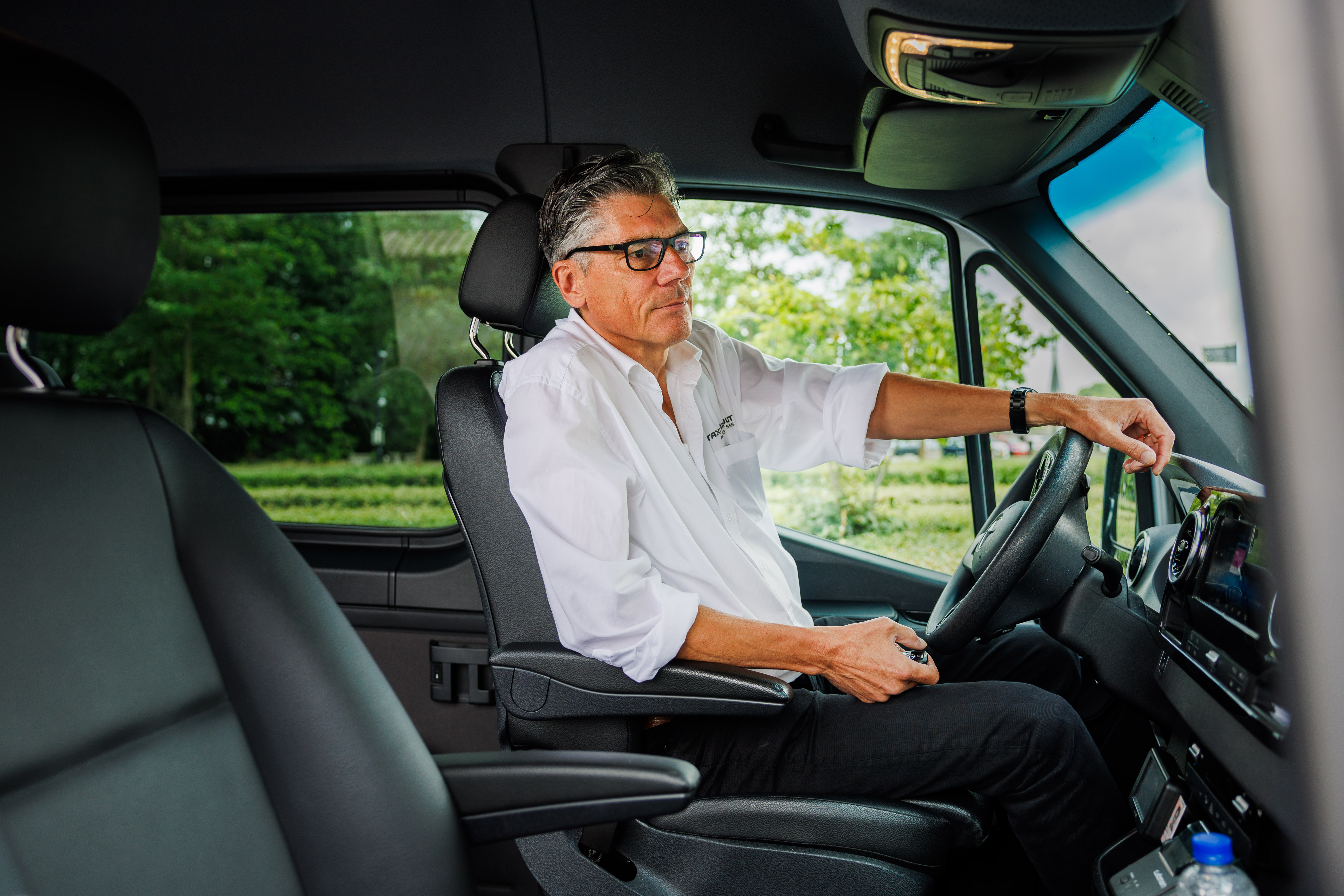 Het nadeel aan zo’n grote taxibus is dat inparkeren niet eenvoudig is op de parkeerplaats van het luxe wooncomplex voor ouderen waar hij vaak ‘cliënten’ ophaalt - en nu koffie wil drinken. ‘Ik zal ‘m maar niet op de invalidenparkeerplaats zetten’, grapt Jongerius met bulderende lach.