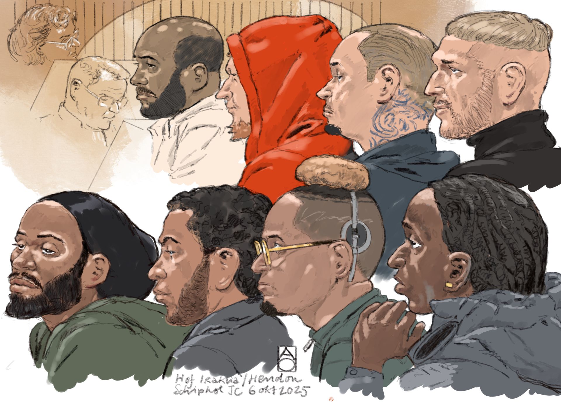 Rechtbanktekening van verdachten op de eerste dag van de inhoudelijke behandeling van het hoger beroep van de strafzaak over de dood van Peter R. de Vries, afgelopen oktober - © Aloys van Oosterwijk