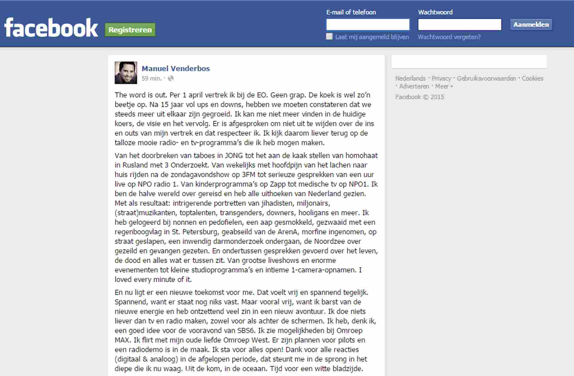 Manuel Venderbos vertrekt als programmamaker bij de EO. Dat maakt hij zelf bekend op Facebook. In november haalde de omroep de presentator al van de buis. Venderbos is onder meer bekend van het programma Jong, dat hij jarenlang presenteerde. Ook was hij vanaf 2008 het gezicht van de EO-Jongerendag. "Per 1 april vertrek ik bij de EO. Geen grap", schrijft Venderbos. "De koek is wel zo'n beetje op. Na 15 jaar vol ups en downs hebben we moeten constateren dat we steeds meer uit elkaar zijn gegroeid. Ik kan me niet meer vinden in de huidige koers, de visie en het vervolg."