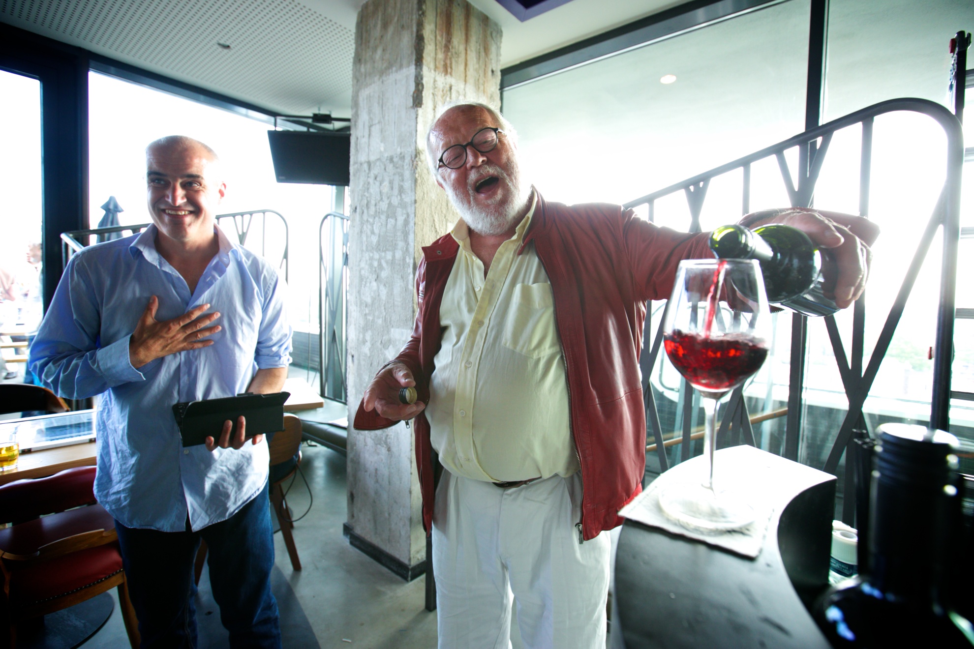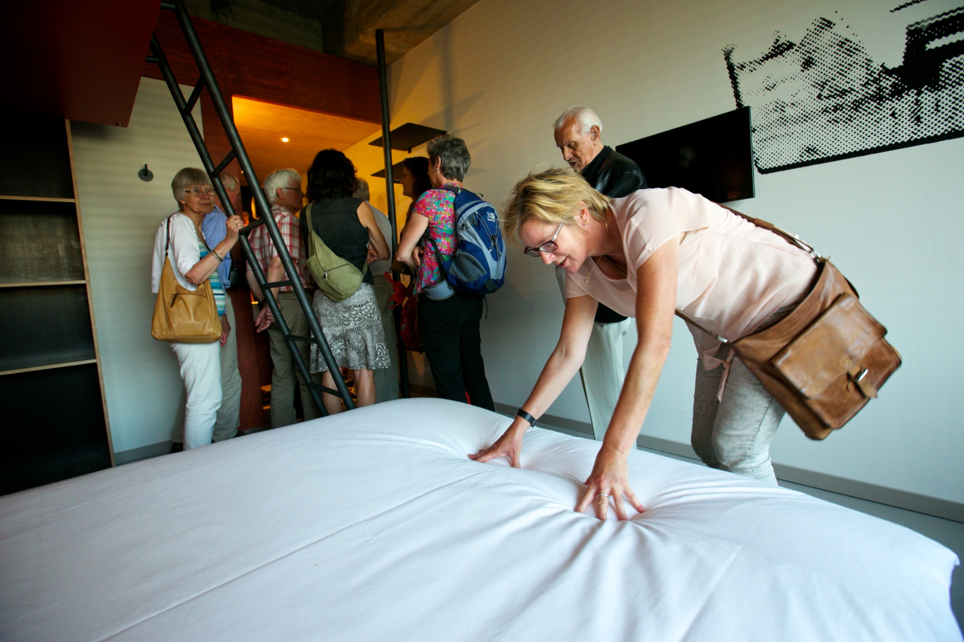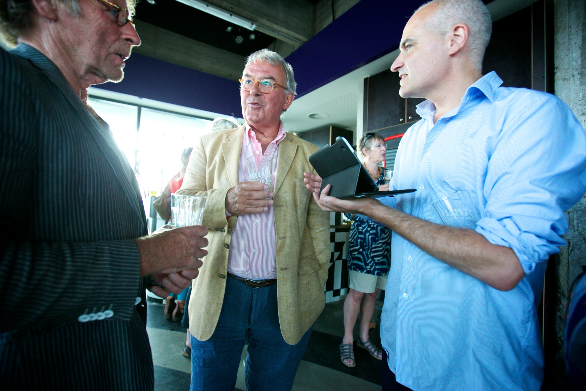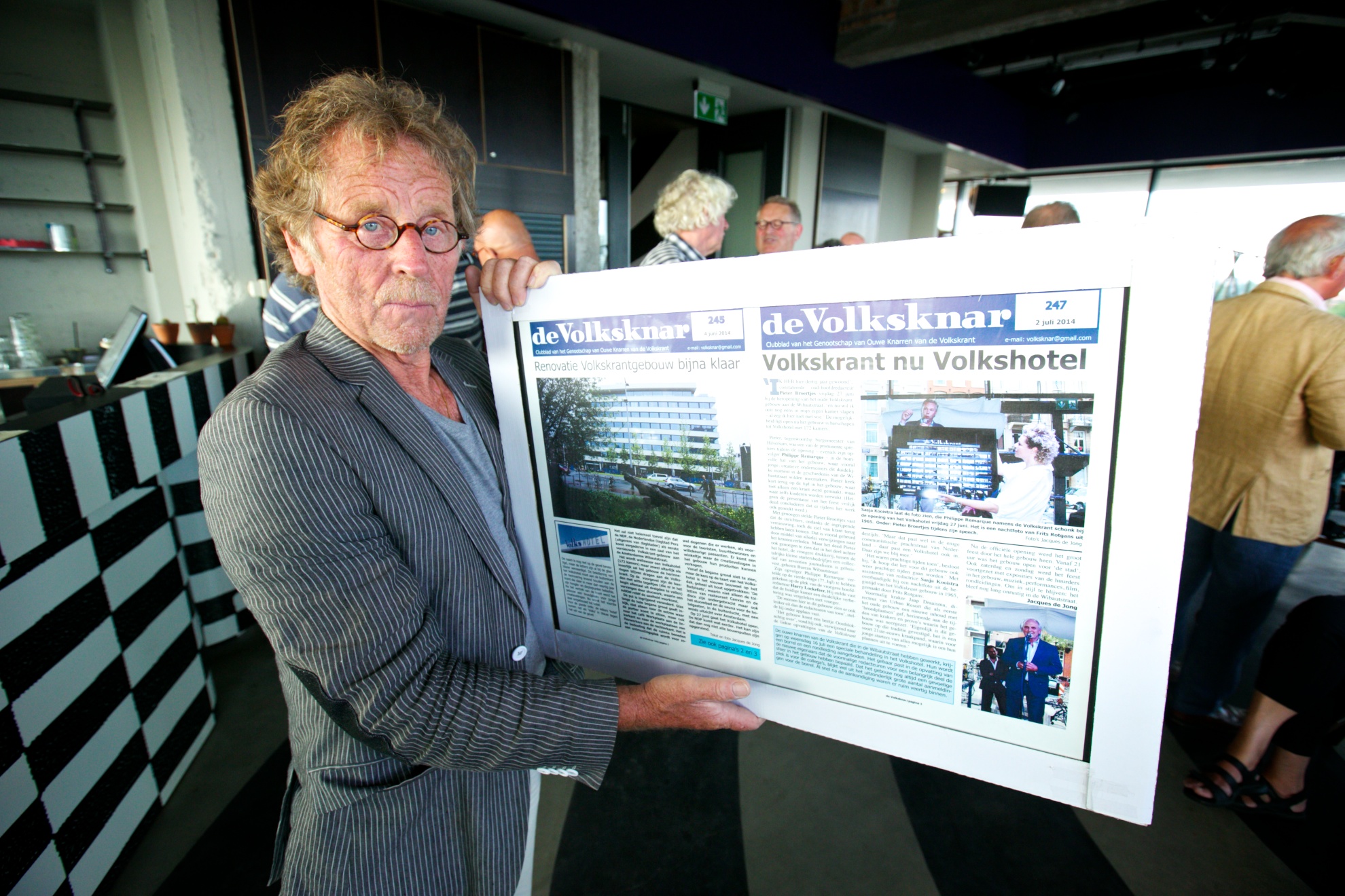 Mark Koster is, met fotograaf Mark van den Brink, graag onder vrienden. Elke maand verslaat hij voor Villamedia een journalistieke borrel. Woensdag 16 juli was hij met ‘de Volksknarren’ te gast in het nieuwe Volkshotel, gevestigd in het voormalige Volkskrant gebouw aan de Wibautstraat in Amsterdam.