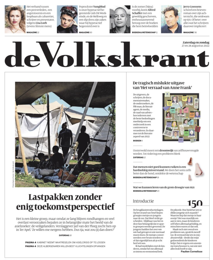 ‘Het stuk waar de kop naar verwijst, vloeide voort uit een eerdere reportage die we in Ter Apel maakten. Daaruit bleek dat er zich gewelddadige taferelen (steekpartijen, diefstal) afspeelden en dat ‘veiligelanders’ daarin een rol speelden. We vonden het belangrijk om ons beter in deze groep te verdiepen omdat, zolang voor hen geen oplossing is gevonden, andere asielzoekers lijden onder geweld en het draagvlak onder de asielopvang wordt ondergraven. Het artikel laat vooral de totale uitzichtloosheid zien waarin deze groep verkeert. Dat wilden we op de voorpagina benadrukken, met de kop (‘zonder enig toekomstperspectief’) maar ook met de intro die afsluit met een wanhoopskreet van een van de veiligelanders.’