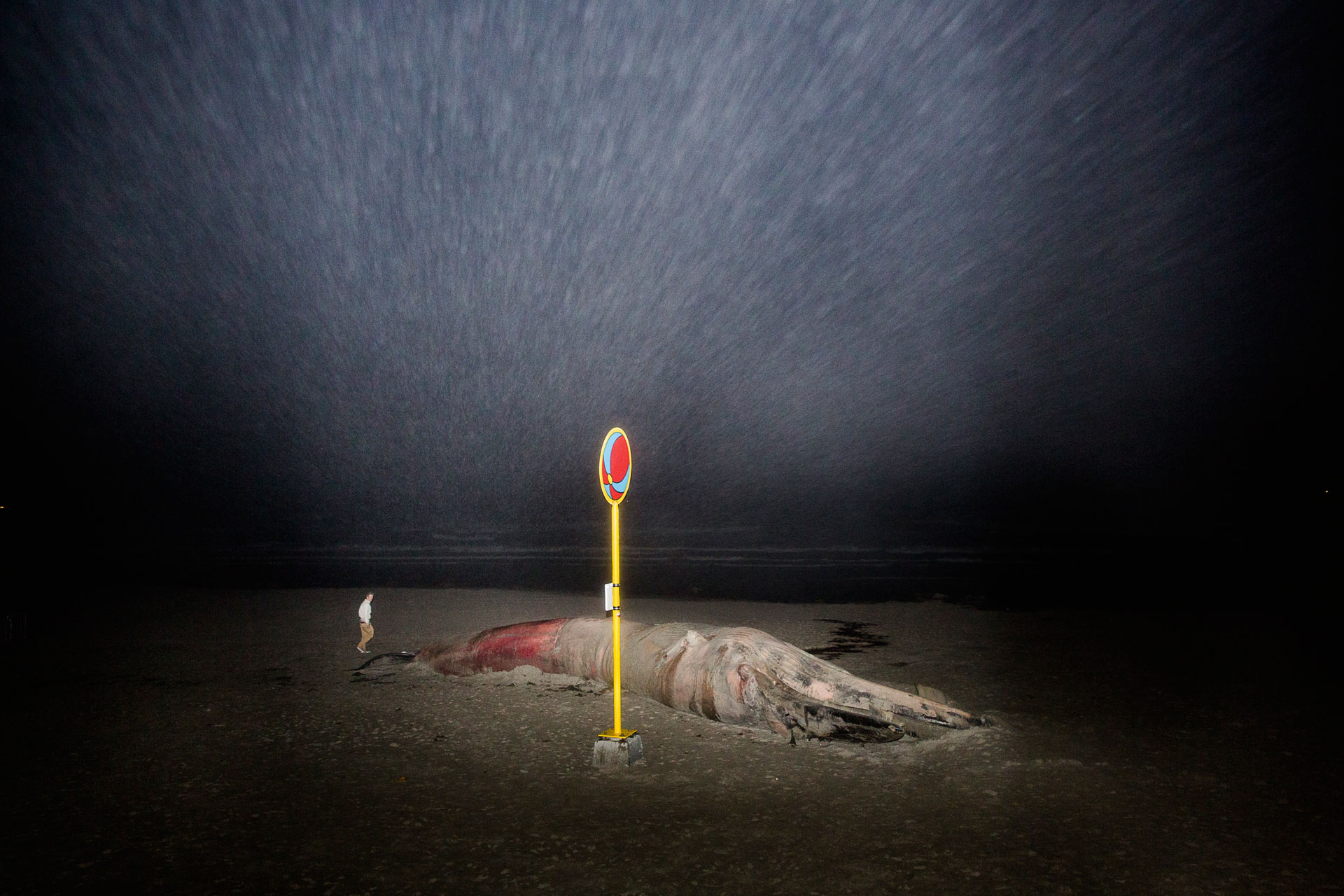 Zijn schoenen, zijn camera tas en zijn auto stinken er nu nog naar zegt foto graaf Peter de Krom. ‘De lucht die van zo’n rottende walvis komt is echt onbeschrij felijk en met niets anders te vergelijken dan met die van rottende walvis.’ Als de fotograaf op maandag avond de 16e september tegen zes uur thuis komt in Hoek van Holland en zijn computer aanzet, vliegen de Facebook meldingen hem om de oren. Alle vrienden en kennissen tonen foto’s en filmpjes van een aangespoelde walvis op het strand van ’s Gravenzande. Dat is ‘om de hoek’, en het ruikt naar een goede foto!