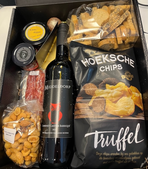 ‘De decadentie!!!!!’, mailt een medewerker van New Skool Media. En op de bijgevoegde foto zien we inderdaad een rijkelijk gevuld kerstpakket, met rode wijn, truffelchips en nog tal van andere lekkernijen.